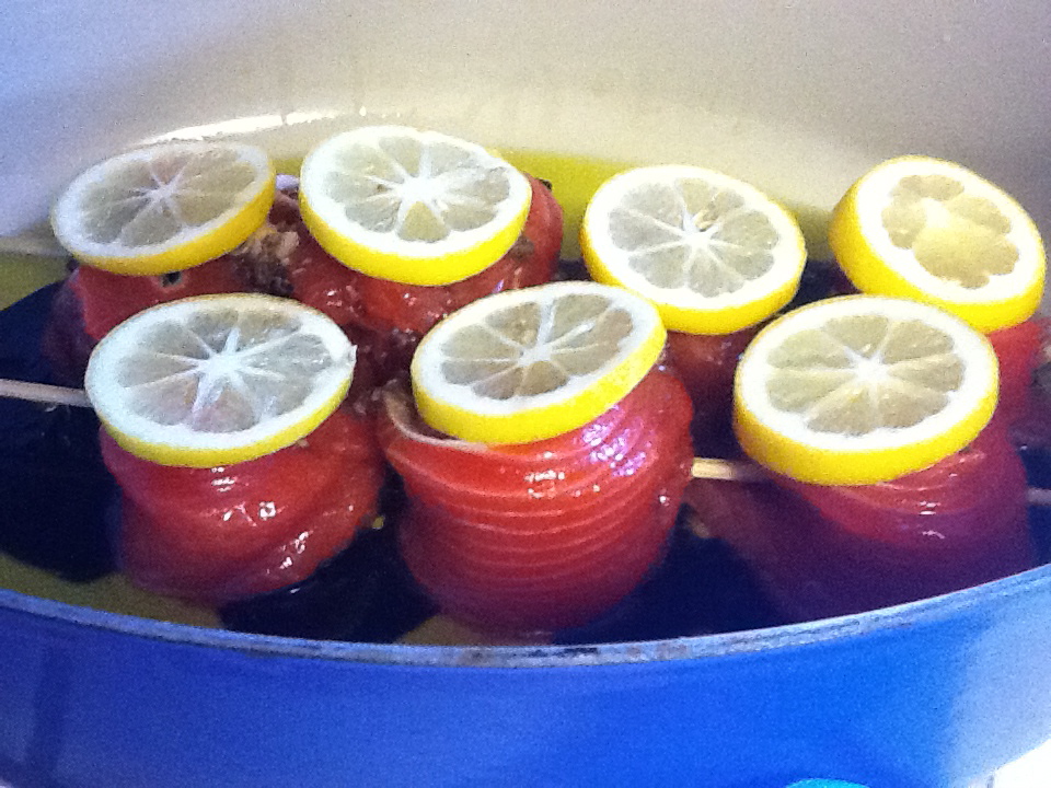 - Coat the pan in olive oil and drizzle oil over the fish and let it saturate. Drizzle the balsamic and garlic mixture generously over each pinwheel. Place fresh lemon slice on top of each pinwheel.