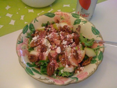 This spectacular salad is a gold medal favorite in our house featuring fresh juicy pears, candied pecans, crumbled Gorgonzola and raspberry vinaigrette on a bed of fresh greens. The original ― and still by far the favorite ― is from the Crow’s Nest in Santa Cruz, where the upstairs Breakwater Bar & Grill offers the salad as an entree with grilled skirt steak! We make constant re-creations of this meal-sized salad in our house and frequently bring friends to experience the original. Here’s how you can make this yummy salad at home too…