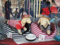 I was able to find some great kibble and a treat for Abby, which she loved much more than the new kibble. Better still, the sweet old man at the dog shop fixed Mama Jude’s cane! While she was hurrying along, one of the three feet came off and was lost. Mama stayed home while I went in search of a way to fix it. My plan was to go to the hardware store after the dog store, but the man in the dog store saw the broken, folded cane on the counter and he fixed it! He and the cane disappeared for a few minutes, and then he was back with a new little foot and he fixed it all up and wouldn’t even let me pay him! I guess it turned out especially handy that the dog shop is also a shoe repair. I was so grateful! And yes, I got one of those hilariously adorable gondoliers’ hats for Abby and one for her cousin Yofi back home. While out walking the next day, Mama Jude came and thanked the sweet man for fixing her cane too.