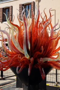 We happily wandered the island (which felt a bit like a smaller and slightly less crowded Venice) and enjoyed the fantastically huge glass sculptures. There was a large glass blown garden in the Italian flag colors, but my favorites were the one that looked like fire (pictured above left) and the huge blue and turquoise icicle-like sculpture (pictured to the right). Storefronts in Murano are filled with some of the most creative glass items you could dream up. From the tiny to the huge, there are figurines of absolutely everything, lamps, frames, chess pieces, jewelry, sculptures and much more.
