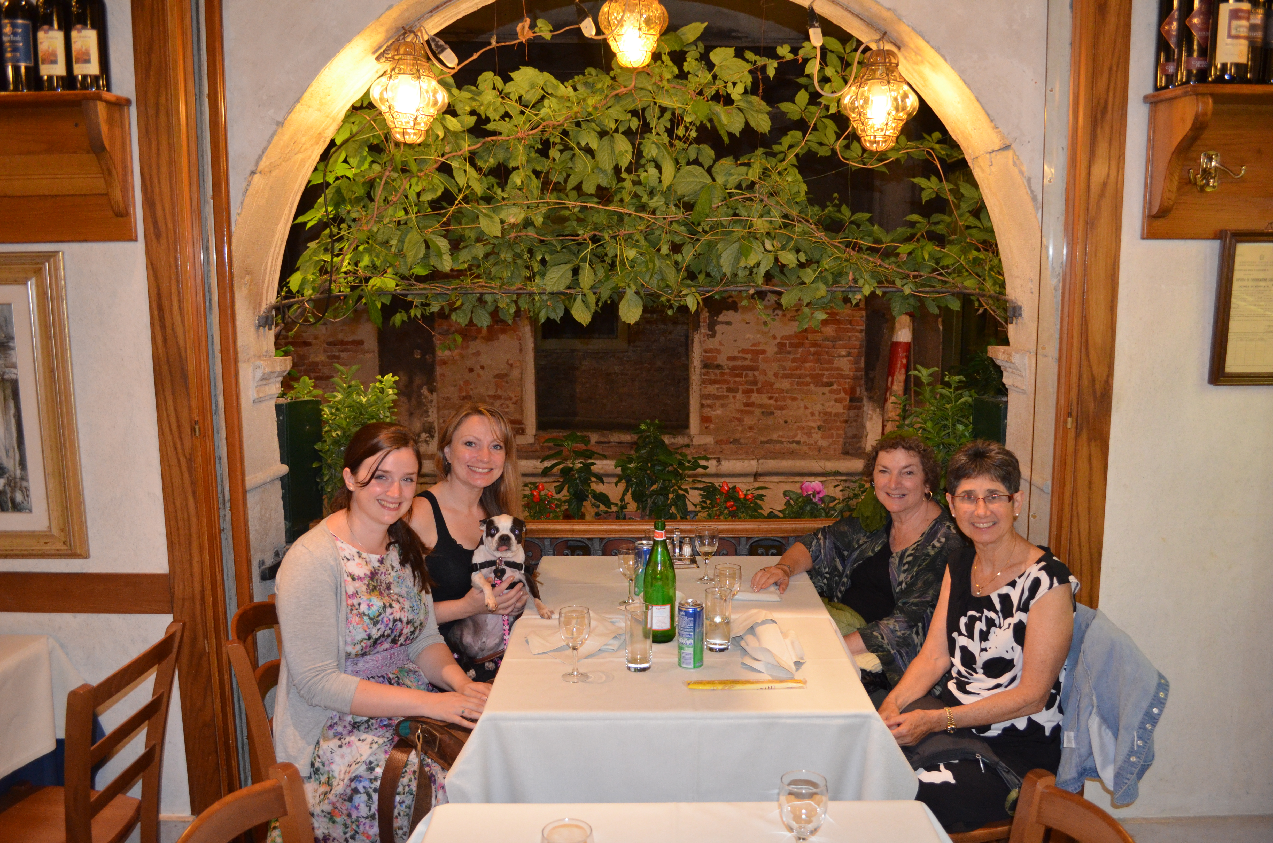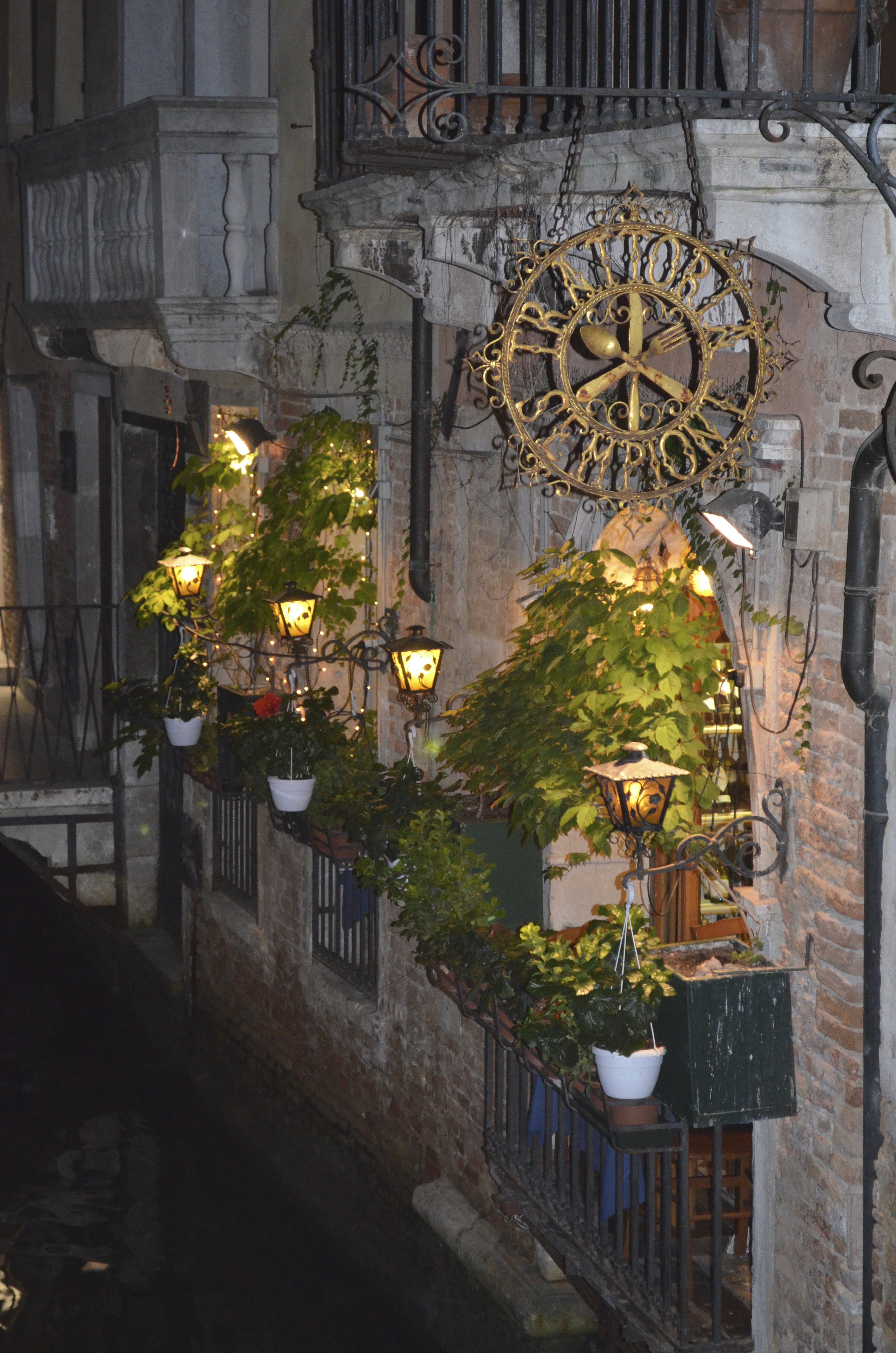 Canalside trattoriaI snapped this one of a beautiful canalside trattoria from atop a bridge on a walk to San Marco from our place near the Rialto. Oddly, we came upon it again from the opposite direction on our way home, and without realizing it was the same place, we decided to eat there! The fish was delicious, the service good and the prices moderate; the ambiance and view were absolutely lovely. (A trattoria is a less formal restaurant.) Here we are quite happy, post dinner sitting on just the other side of where the first picture was taken…