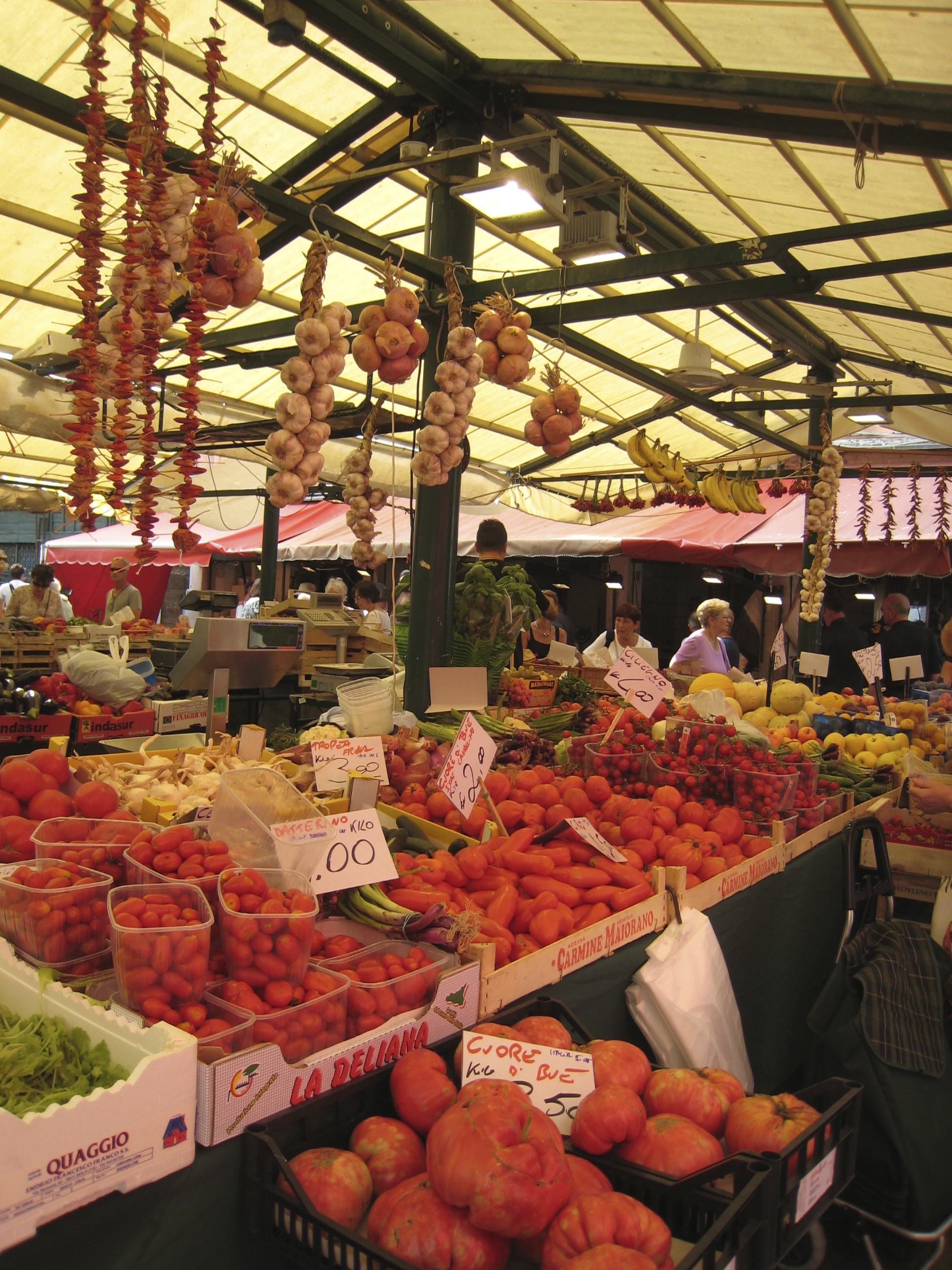 And here’s our loot from the market all spread out on our dining room table (with windows onto Campiello del Remer and the Grand Canal)… yep, we got some artichoke discs!