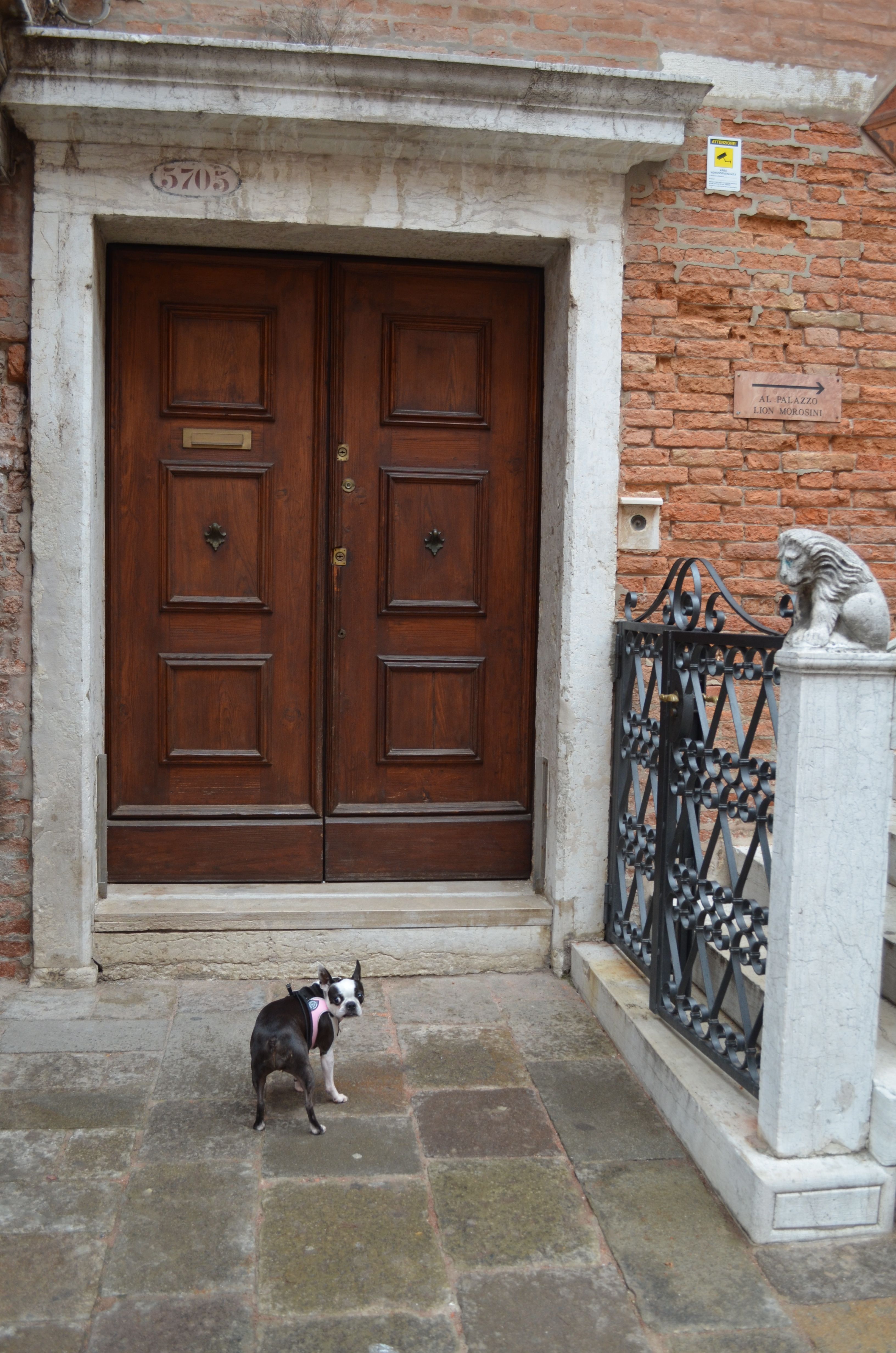 Abby, our little Bug (Boston Bull Pug), has a great sense of direction, among her many wonderful traits. She loved to try to lead the way, and once we got near enough to home, I’d unhook her leash and let her lead us through the last two alleyways and courtyards. Abby was very popular in Venice and she loved to greet our Venetian friends along the way. Here she is stopped by the stone lion outside our front door and looking back to make sure we were following her. Abby is incredibly sweet, caring and cuddly, happiest when she’s with both me and Mama.