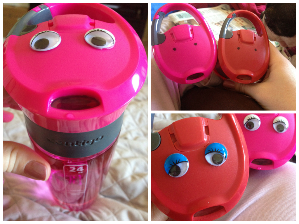 These fun googly eyes have eyelashes painted on for a stylish, yet whimsical touch. I also added a cursive monogram vinyl sticker along the bottom part of the bottle. You can apply your googly eyes to the side of the bottle, but then you don’t get the eye-to-eye encounters!