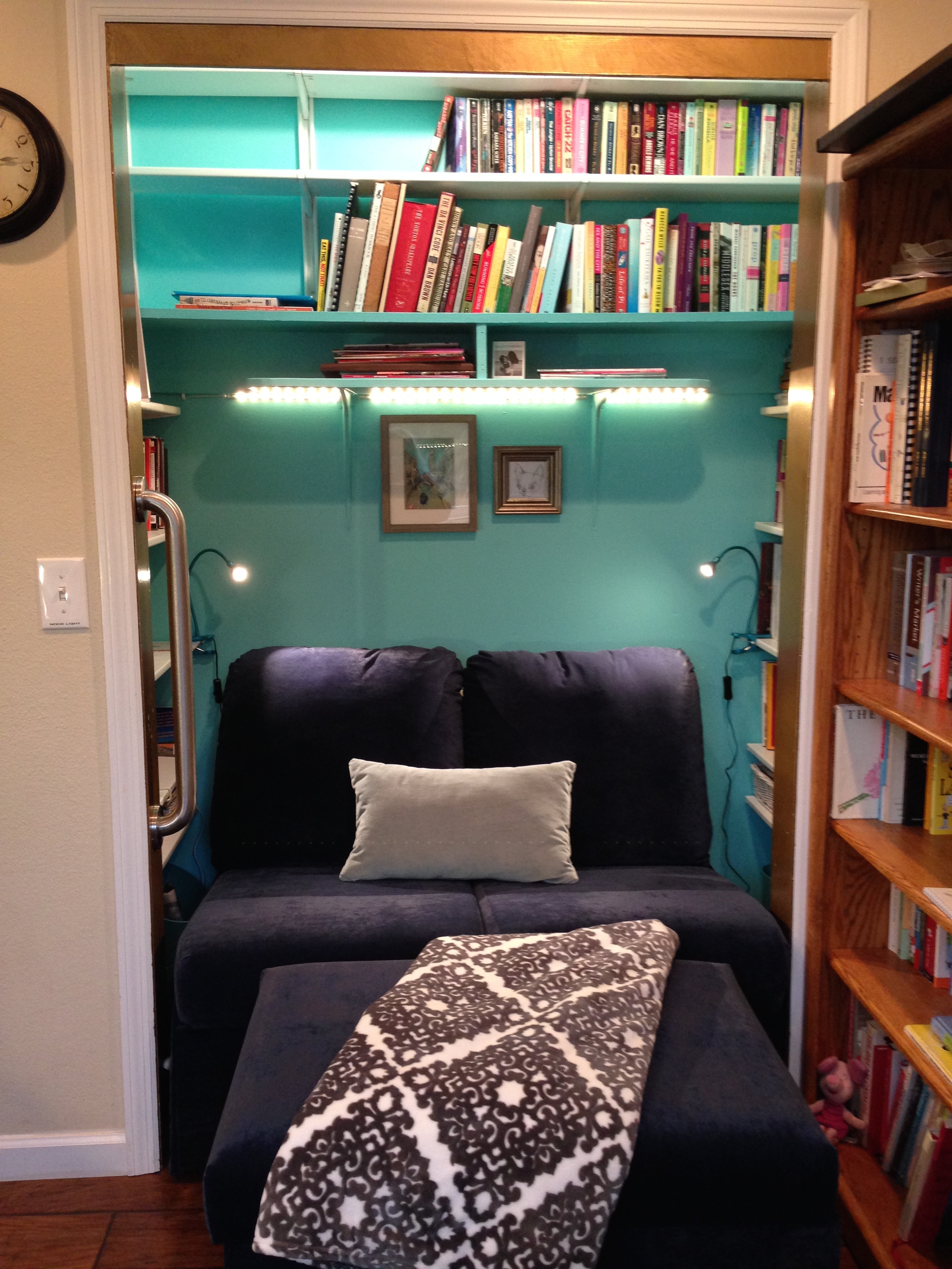In addition to the closet light, which nicely illuminates the books in the top half of the nook, we installed an IKEA LED light strip under the bottom shelf behind us. We also added a small turquoise flexible reading light on each side.