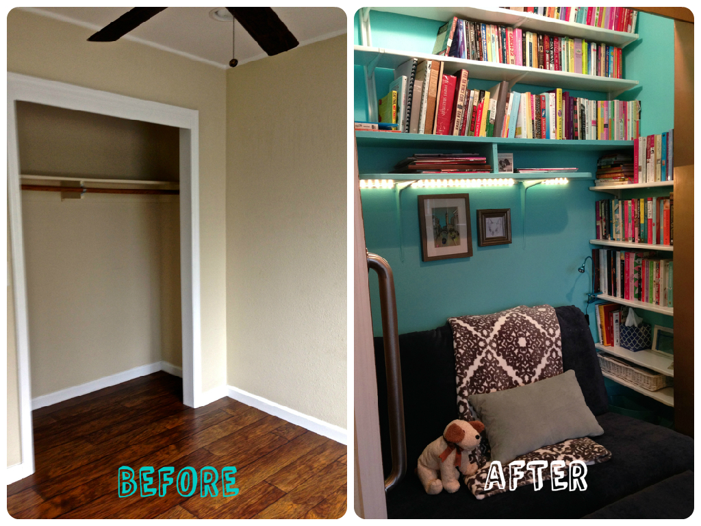 Next up was the office closet. We didn’t want to fill it with junk or overflow storage, but instead make it more usable space. So we came up with the idea of a reading nook with a comfortable place to sit and plenty of room for books. We love books. Though we now mostly read e-books and we donated loads of books before moving, we still have a lot of books. Here’s our inspiration from Pinterest.