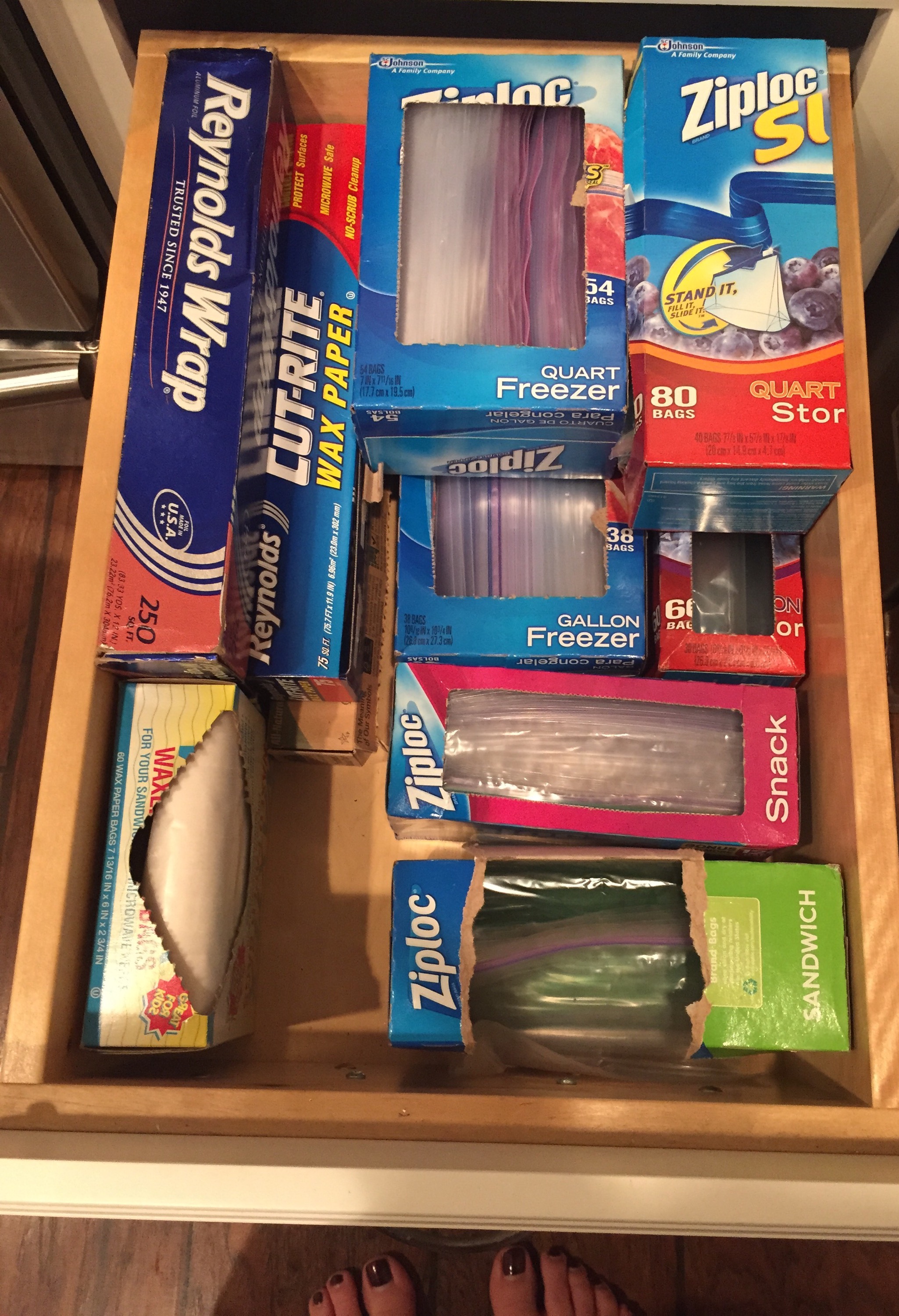 So last week, I reorganized the kitchen pantry and installed another shelf in the top of the hall closet. Today, I tackled a kitchen drawer that never wanted to close all the way and was always driving me nuts when I needed anything from it — the drawer filled with ziploc bags of all sizes, foil, parchment paper, etc. It’s now beautifully organized and accessible. And extra supplies (what I like to call our home Costco) are stashed away at the top of the pantry with a note taped inside the cupboard door listing quantities (you know, should we ever run out again).