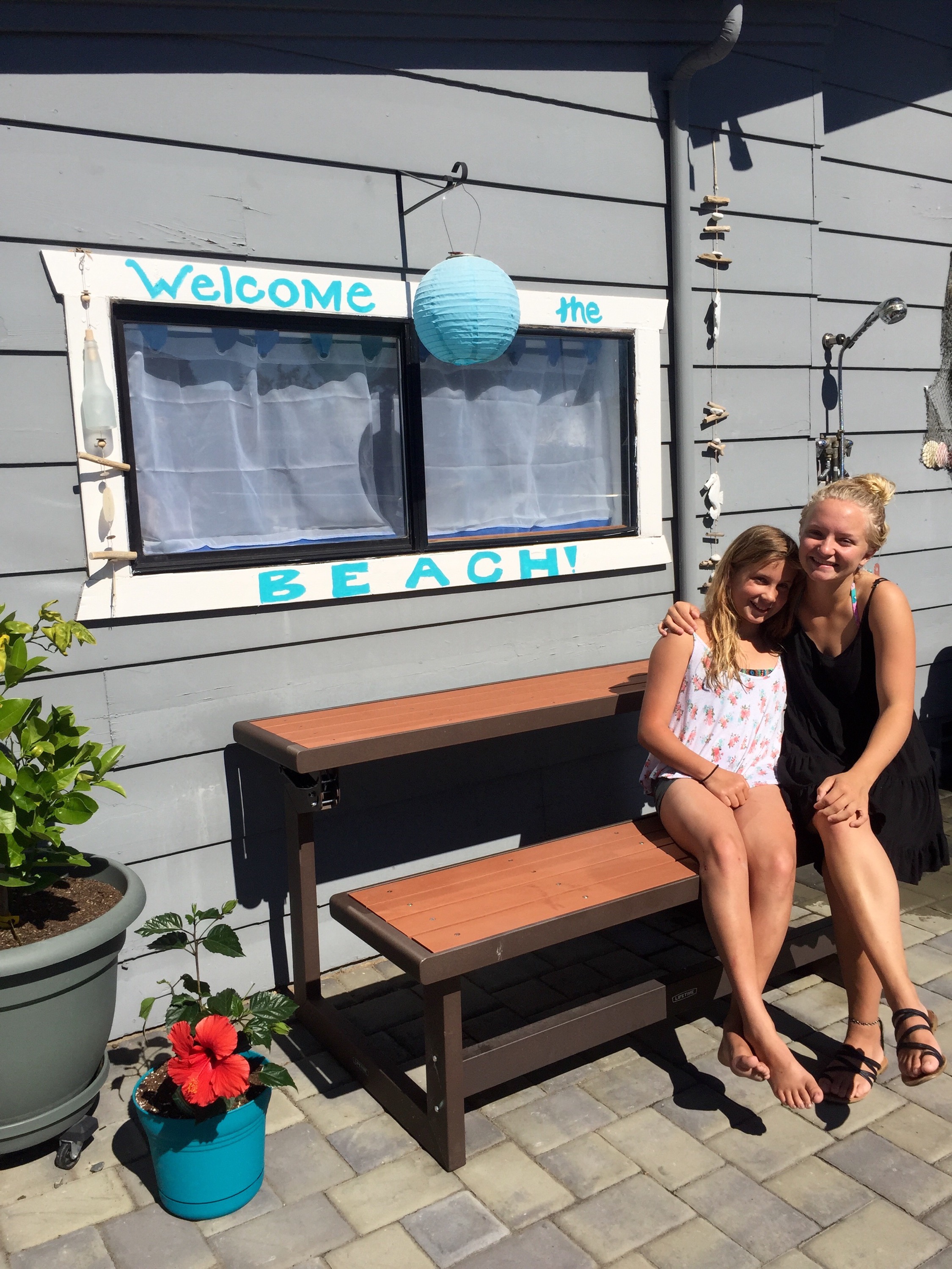 Since we moved from living near the beach, we decided to create a beach theme in part of our back yard. Last fall, I penciled in the words “Welcome to the Beach” around this window (in the photo). Mama and I even picked out the turquoise paint, but we never were able to get around to painting.