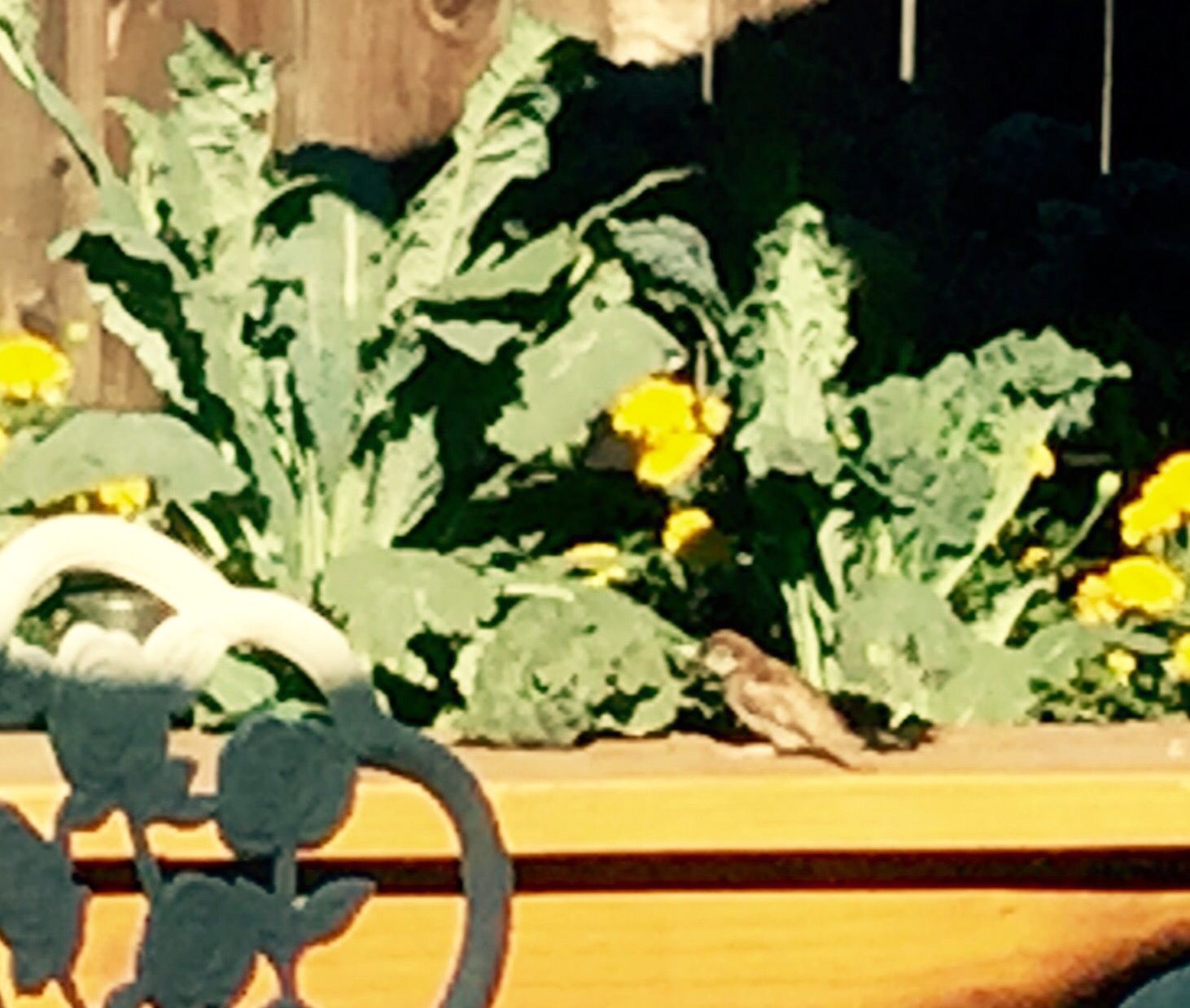 Today we happened to look out Mama‘s bedroom window and notice about a dozen little birds happily chomping down on our kale and lettuce. We sat mesmerized watching them. Most of the birds perched on the edges of the box and even on the leaves while eating, while others hovered in the air and ate on the go.