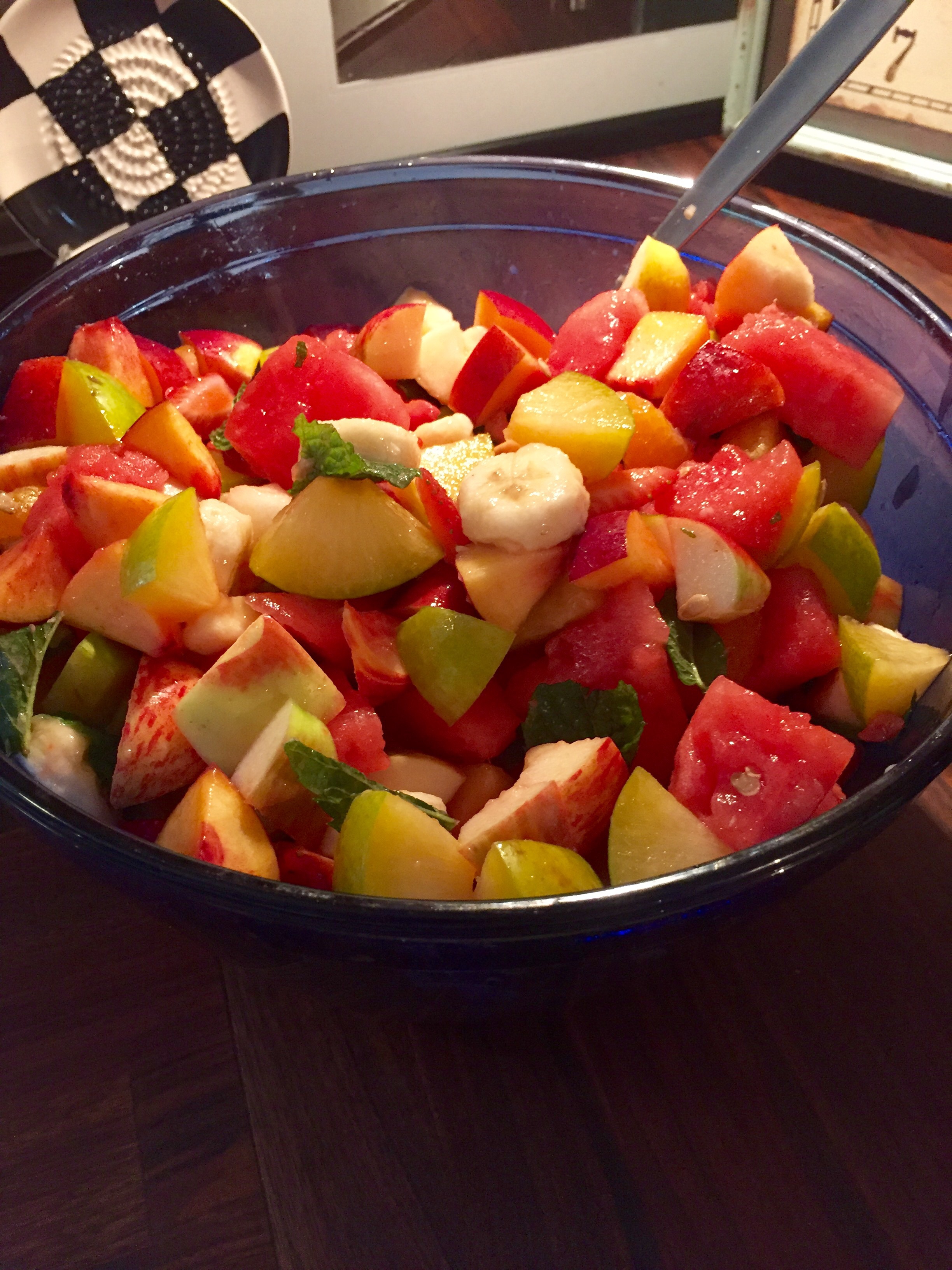 Today my friend Rachel came to visit. We used to work together many years ago. Since that also seems like a past lifetime, brunch was fitting. Rather than the challah French toast, I went with an assortment of freshly baked croissants (a la Trader Joe’s). We made a summer fruit salad with all of our seasonal favorites (yep, Emerald Beaut pluots were in there, plus mint from our garden). And Rachel brought a pumpkin coffee cake that was just perfect! Great food with a great friend!