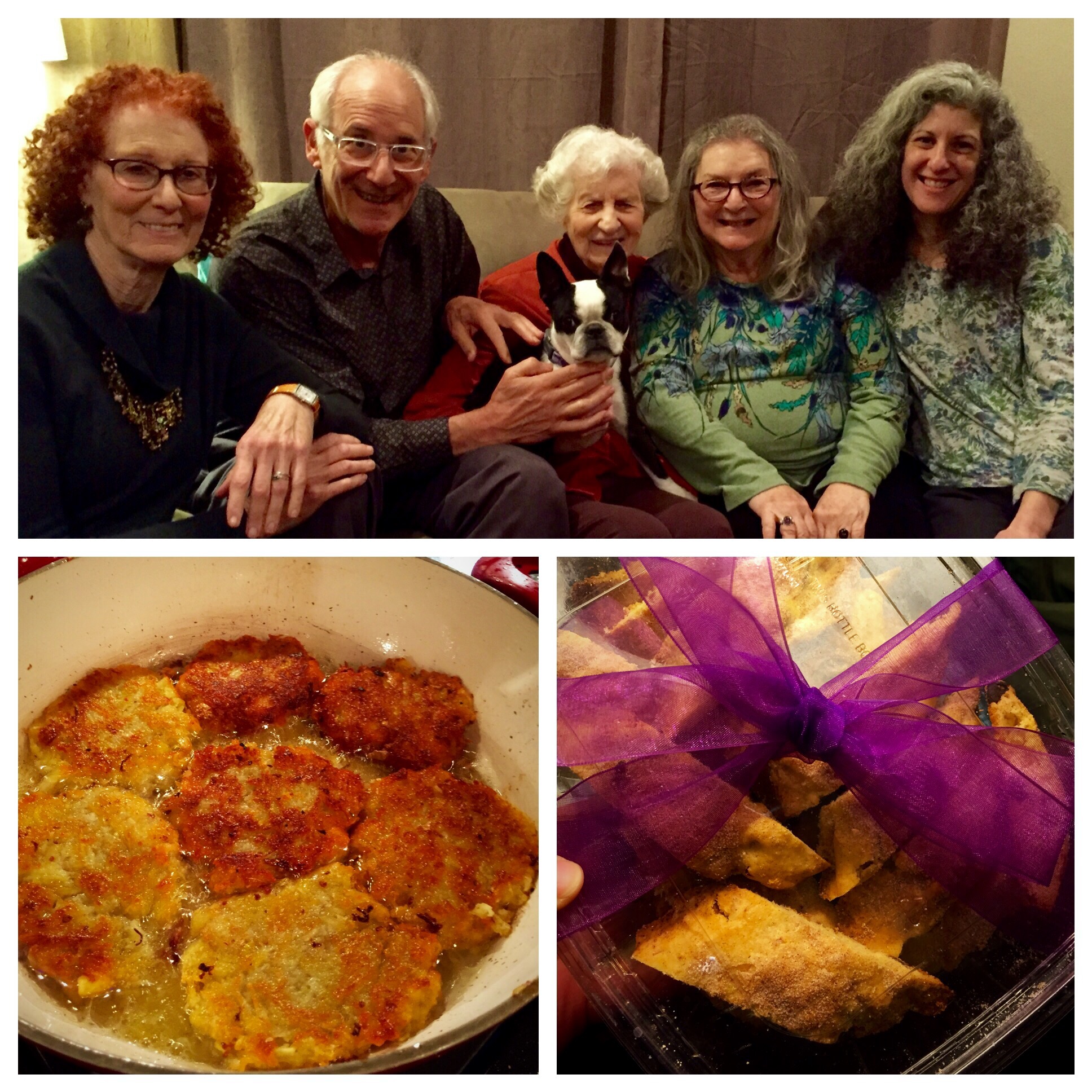 Top (L-R): Bonnie, Phil, Bobbie with Paisley, Mama and Margo; Bottom L: frying latkes; Bottom R: Mandelbrot gift!