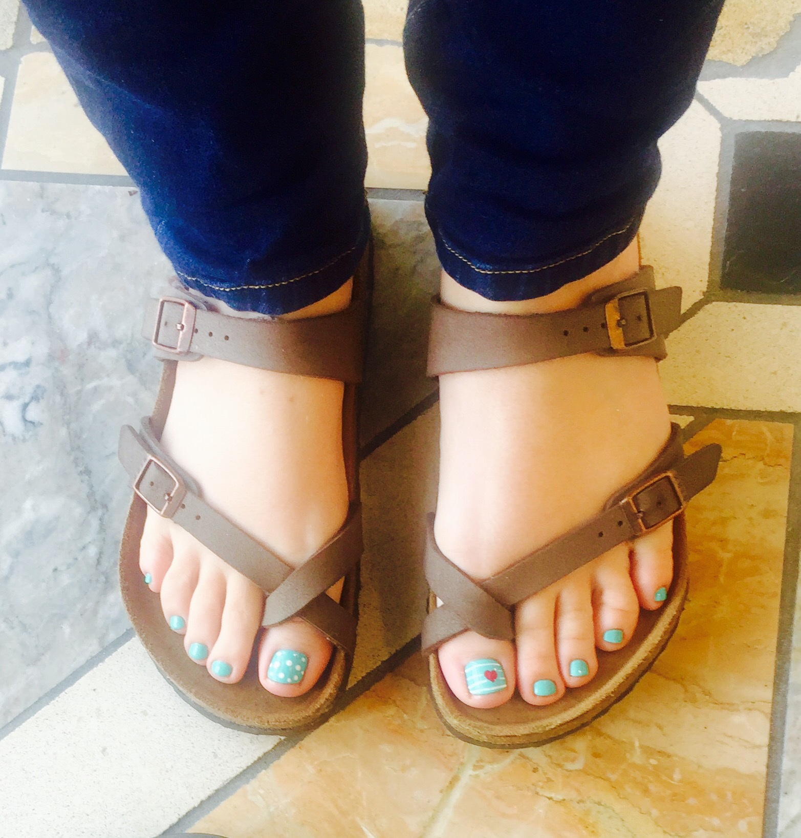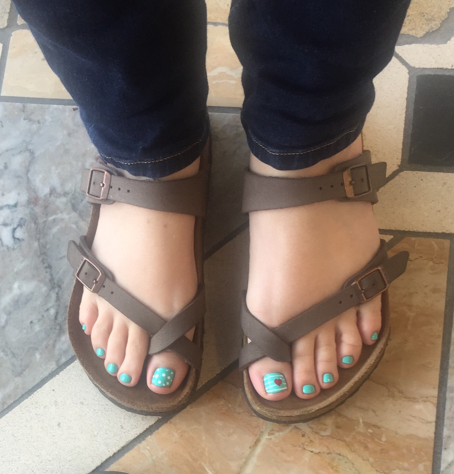 For our pedicures, I decided to experiment with color and went with turquoise. Also, one big toe has white polka dots and the other has white stripes behind a pink heart. Every time I see my happy toes, I smile!