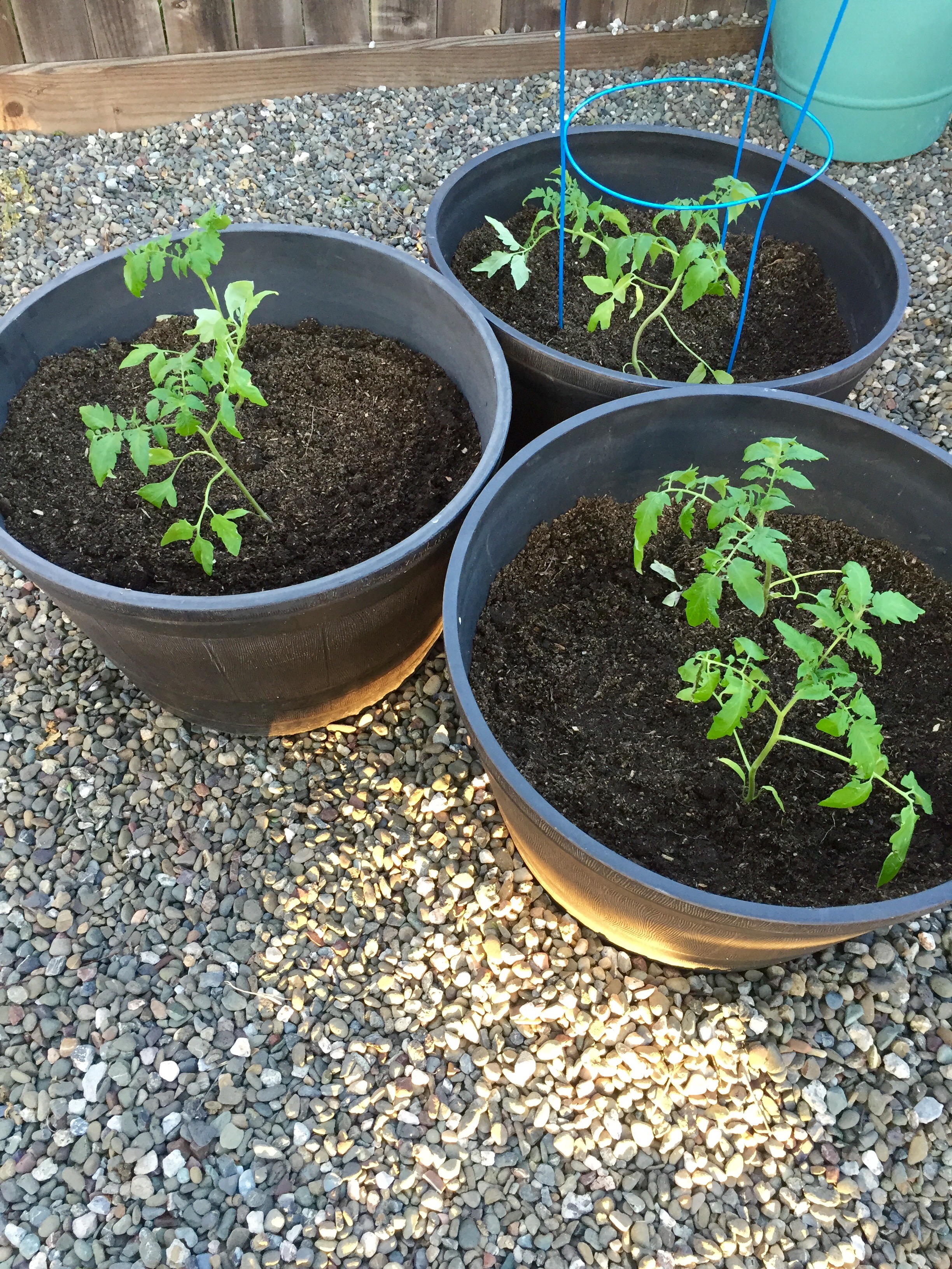 We had six plants and three, big barrel planters. Unfortunately, we could only find one tomato cage in our yard. I could have sworn we had two, but one has apparently gone missing. So now we’ll need to pick up two more cages this week.