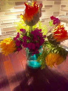 They were a birthday gift from one of my best friends and they’re lovely! The sunflowers have begun to open, and I love the gorgeous turquoise jar vase. It was so nice to come home to something beautiful and fresh to brighten our living room. Thank you (you know who you are)!