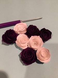 I’d cut out the flat rose shapes about a week ago and found a video explaining how to assemble them, but I was unable to roll them without a little curling tool. It looks like a thin stick with a slit in the end to grab the paper and help you curl it. This nifty little crafting tool arrived in the mail today and I was excited to assemble my roses.