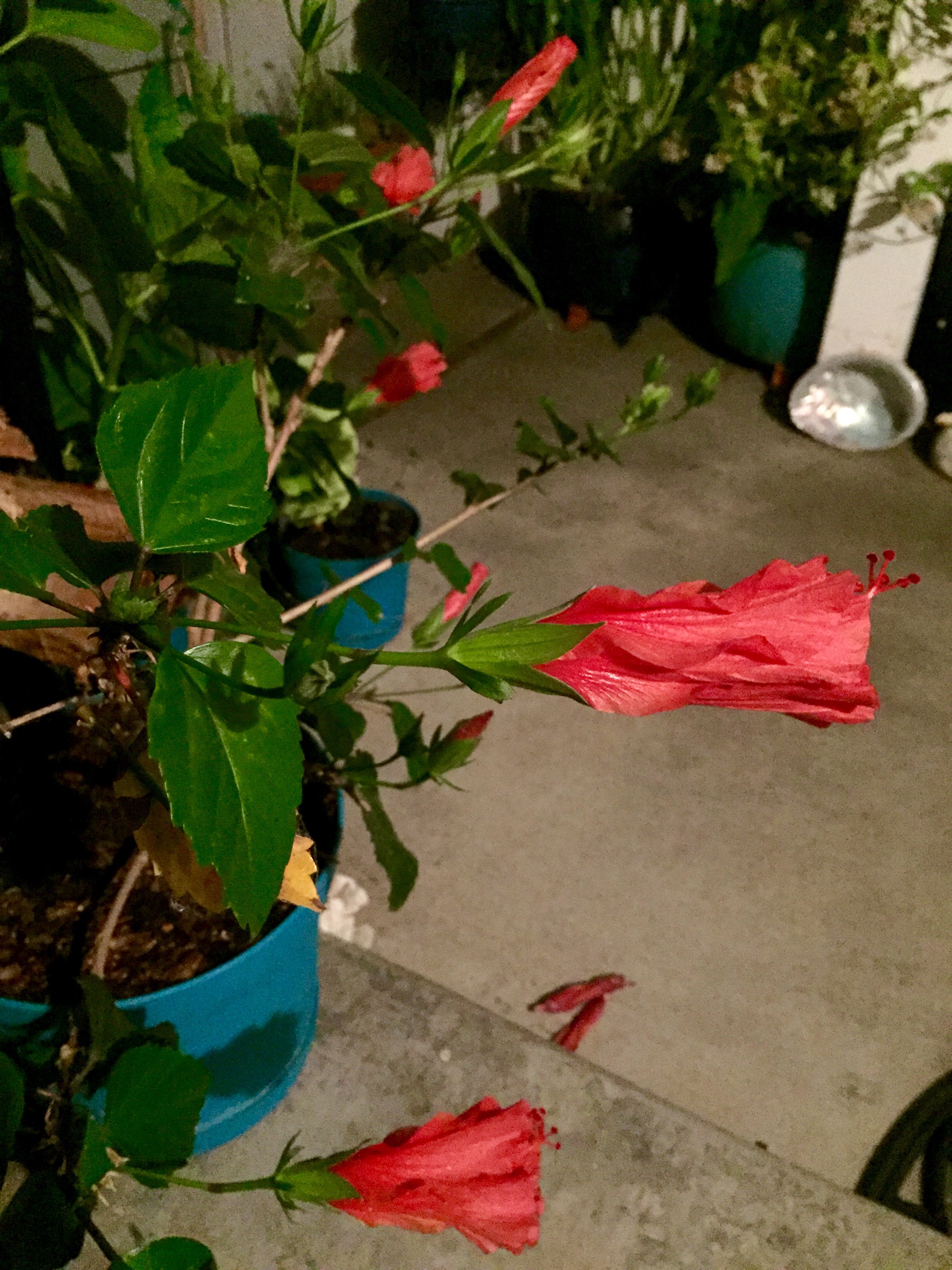 Despite the ongoing heat wave, our hibiscus plant bloomed big today! Mama and I counted seven flowers with an eighth about to open (and two fallen on the ground).