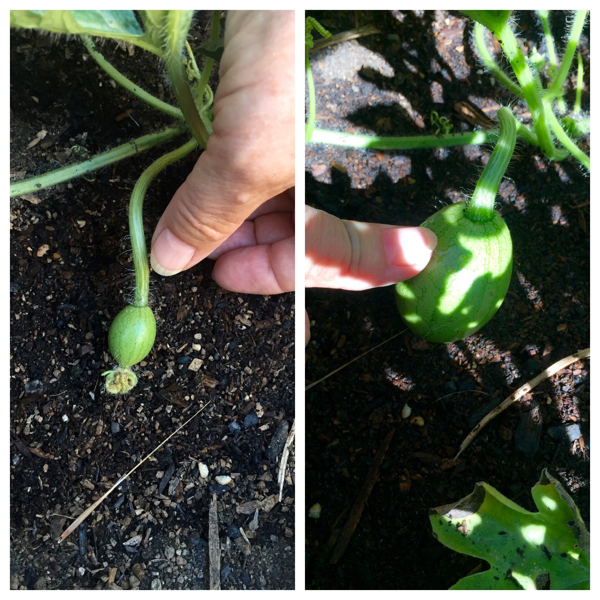 Mama and I discovered the first tiny little melon last week — and after just four days it had quadrupled to the size of a small egg! That’s Mama’s thumb in the photos to give you a feel for the size of these baby melons. Full size is apparently about 8 to 10 pounds!