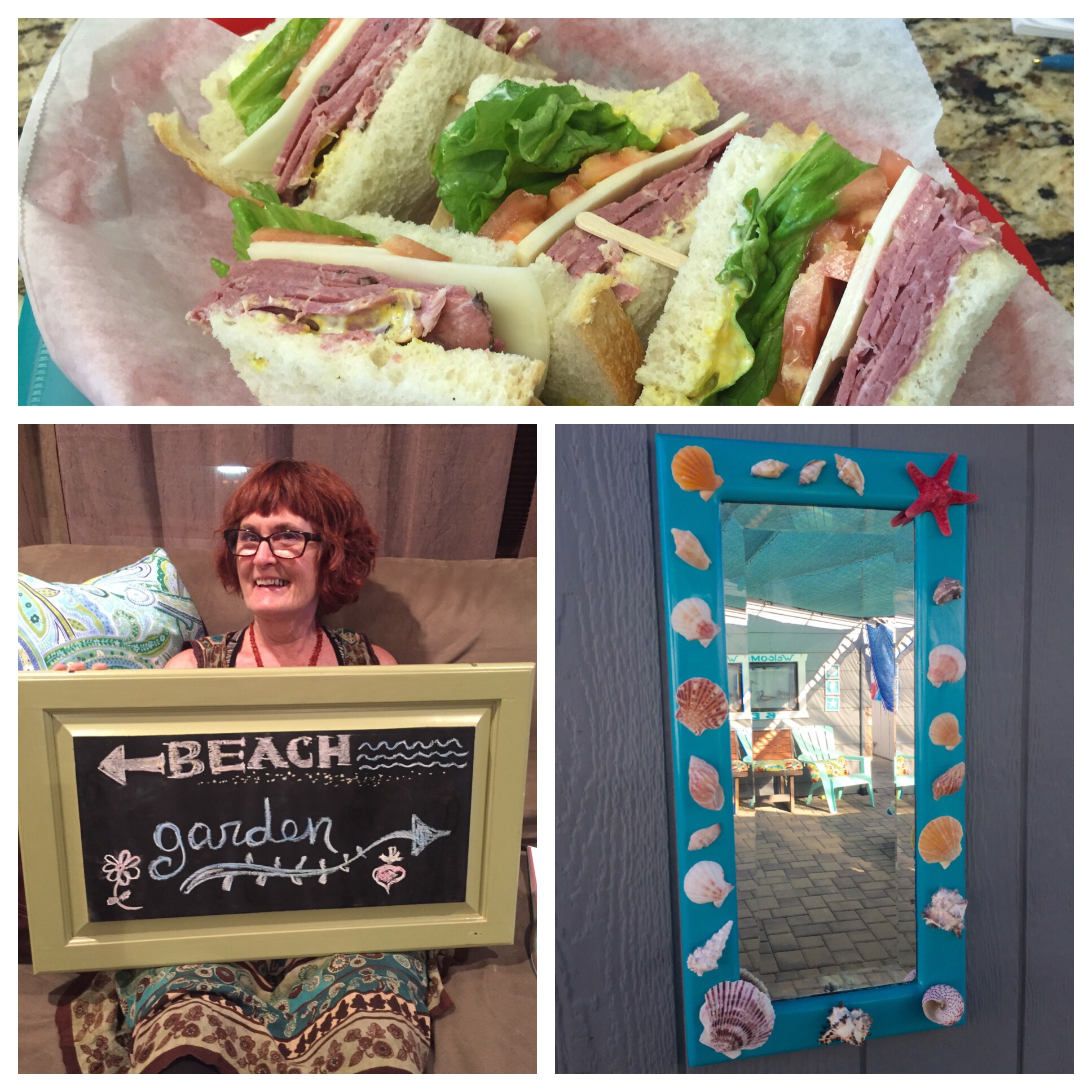 I also finished and hung this awesome turquoise shell mirror that I gave a makeover. I turned an old mirrored cupboard front (that I picked up for $5 from the local Habitat for Humanity store) into a sunscreen mirror for our beach oasis backyard!