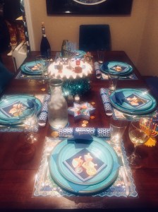We loved sharing the holiday with our friends and teaching them how to play dreidel with chocolate gelt. And the jelly donut holes for dessert were so good! Our home felt festive with a colorful paper chain, candles glowing, dreidel place cards, and British Chanukah crackers with paper crowns and jokes.