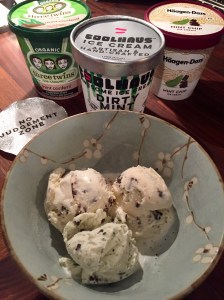 None tried to fake us out with green coloring, so that seemed a good start. All three had a strong mint flavor, but the Dirty Mint was more like garden mint. The chocolate bits were all tasty, but we preferred the chunks in the Haagen-Dazs to the tiny chips (Coolhaus) or the flakes (Three Twins).