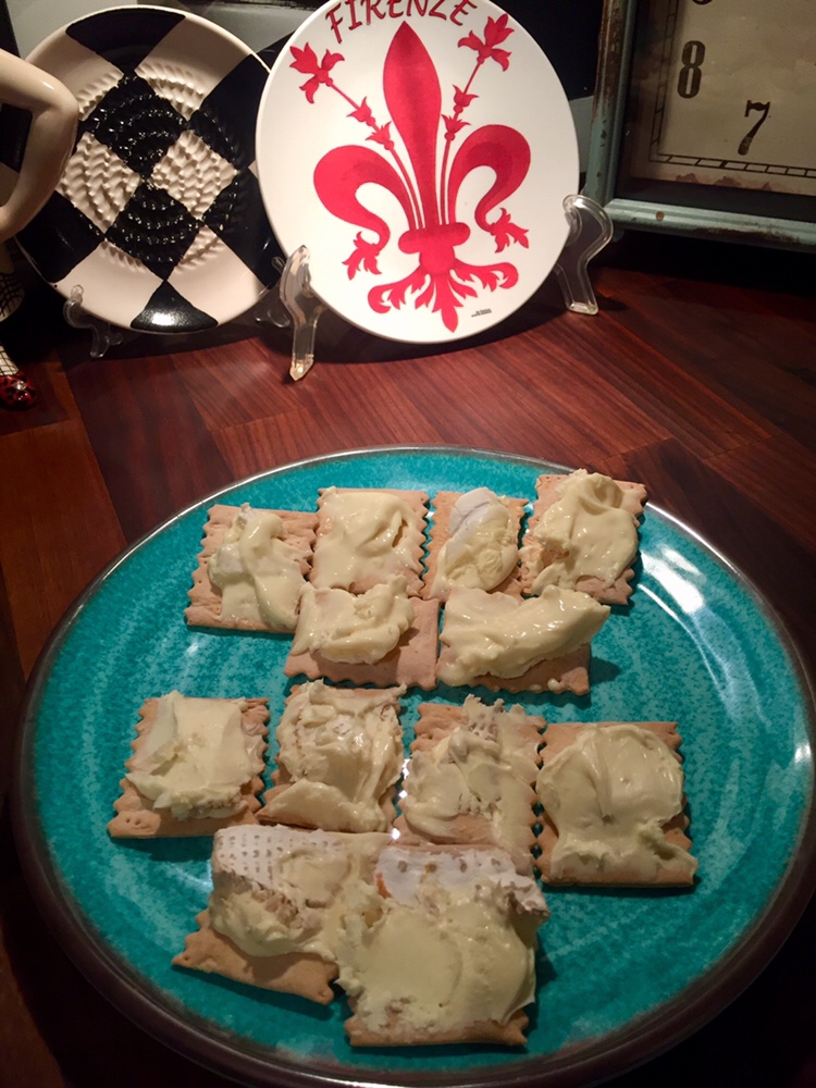 We’ve been eagerly looking forward to our cheese on crackers treat. One is a double cream brie and the other a triple, but I created a blind taste test for Mama. She correctly guessed which was which, and we both agreed that the triple cream had a slight edge over the double. It paired beautifully with Moscato di Asti wine and made for a delicious little feast!