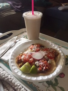 I picked up several steak and chicken tacos along with glasses of refreshing horchata. The tacos were tiny, but inexpensive. The people at the taco truck were really nice and made our food without cilantro (we’re allergic). We’ll definitely return, though we’ll ask for no onions next time as they were a bit strong.