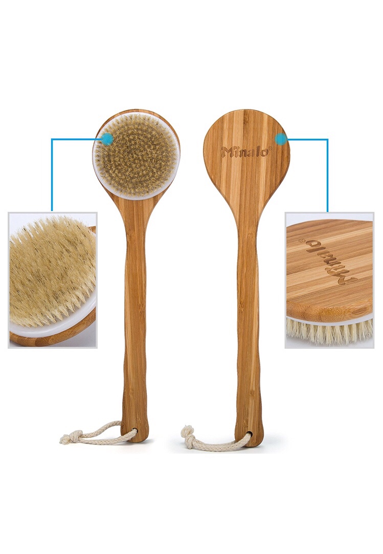 Minalo Natural Bristle Dry Body Brush with Long, Wooden Handle