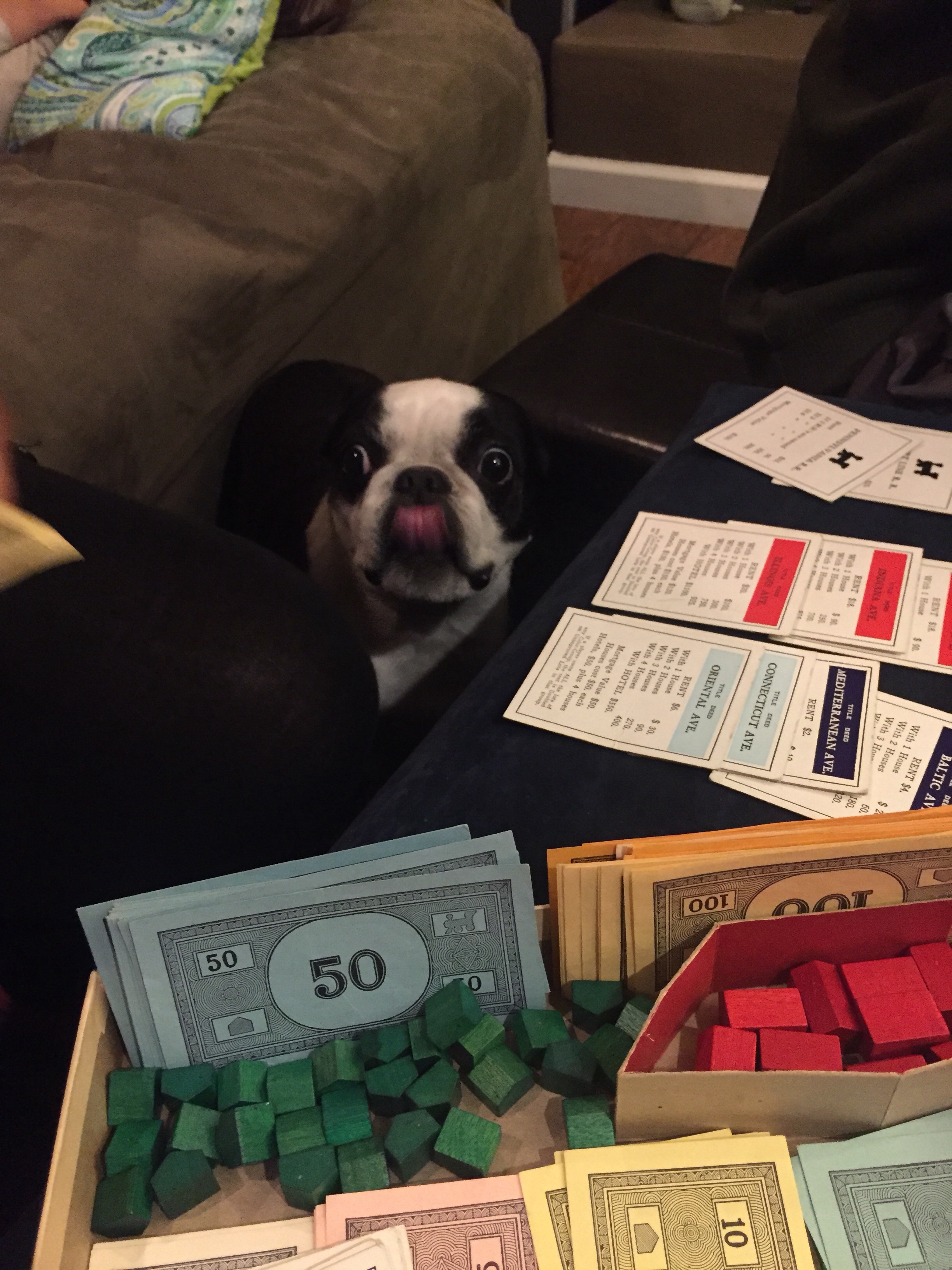 First we played Quirkle Cubes, which is a bit like Scrabble or Bananagram, except with colors and shapes instead of words (and cubes instead of tiles). Then we feasted on roasted leg of lamb and sweet potato salad. Paisley also discovered that she LOVES lamb! Once we were all stuffed, we gathered around Mama’s Monopoly board with wooden pieces from her childhood. We finished off the night with Haagen-Dazs Peach Sorbet and hugs!