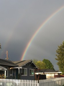 We opened the front door and were taken aback. A massive, bright rainbow stretched directly above us, and it looked like it ended in our own back yard. There’s even a faint double rainbow.