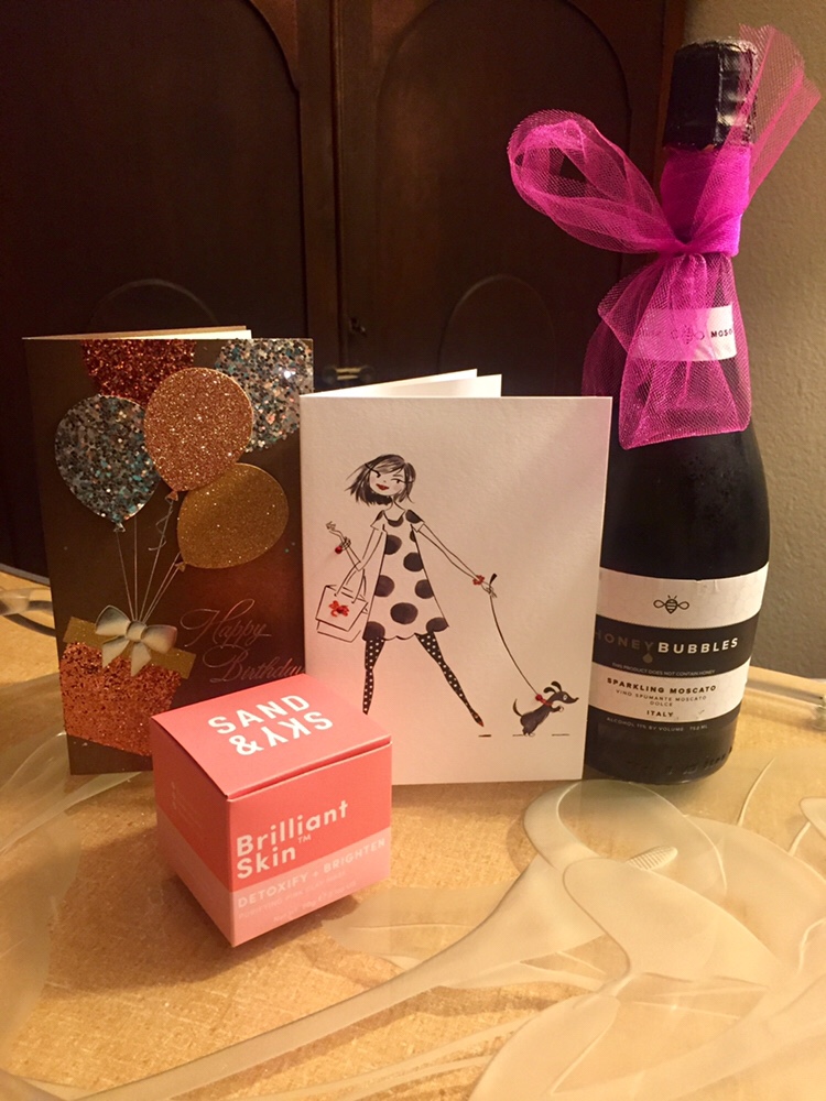 A package from Los Angeles contained a purifying pink clay mask to detoxify and brighten my skin, and a hug at our front door included a bottle of my favorite variety of wine. Both gifts came with very sweet cards, which are now on display!