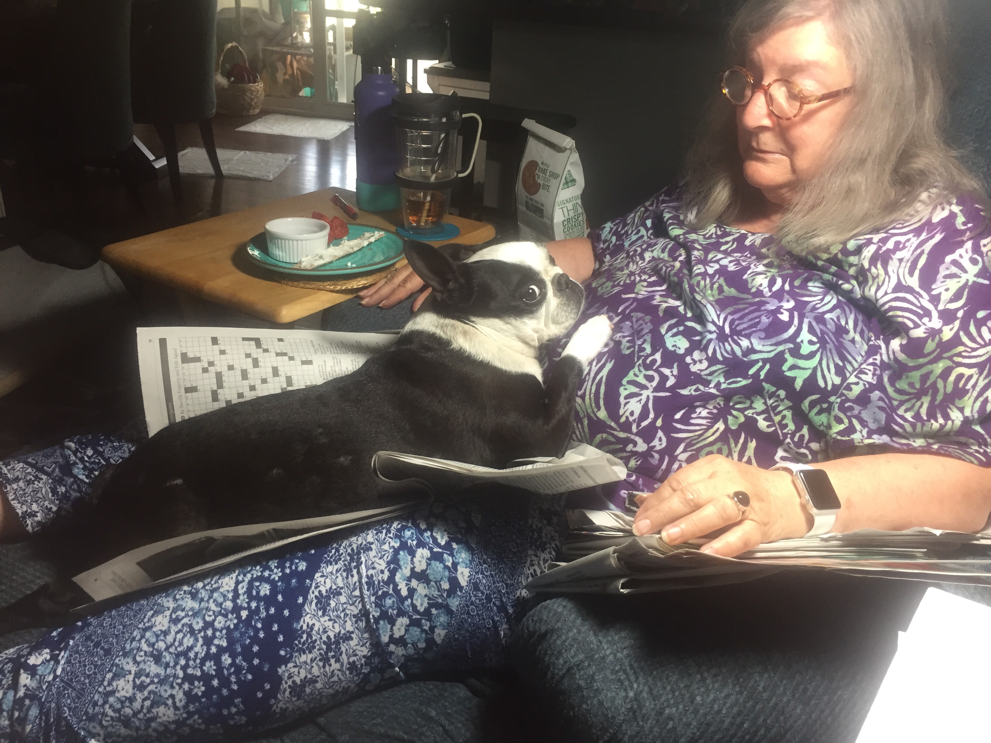 Mama was reading the newspaper this afternoon when Paisley decided a cuddle took precedence.