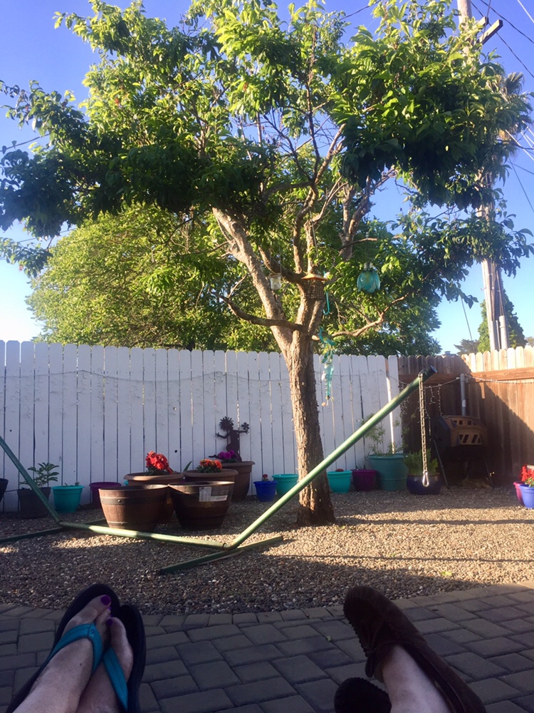 I even became vertical for a bit. Late in the afternoon, Mama and I ventured into our backyard for some fresh air. We enjoyed sitting in the shade, seeing our Santa Rosa Plum tree highlighted in sun, and listening to a chorus of birds singing.
