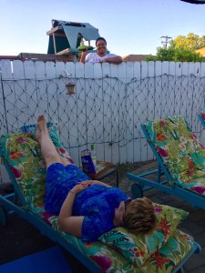 Though we share a long fence line, our front doors face different streets. Rather than walk the long way around the corner on the busy street, Ti stood on a step ladder at the fence and I lounged backwards on a chair so we could see each other (Mama found us like this and thought our set-up was so funny she had to take a photo). We had a great time!