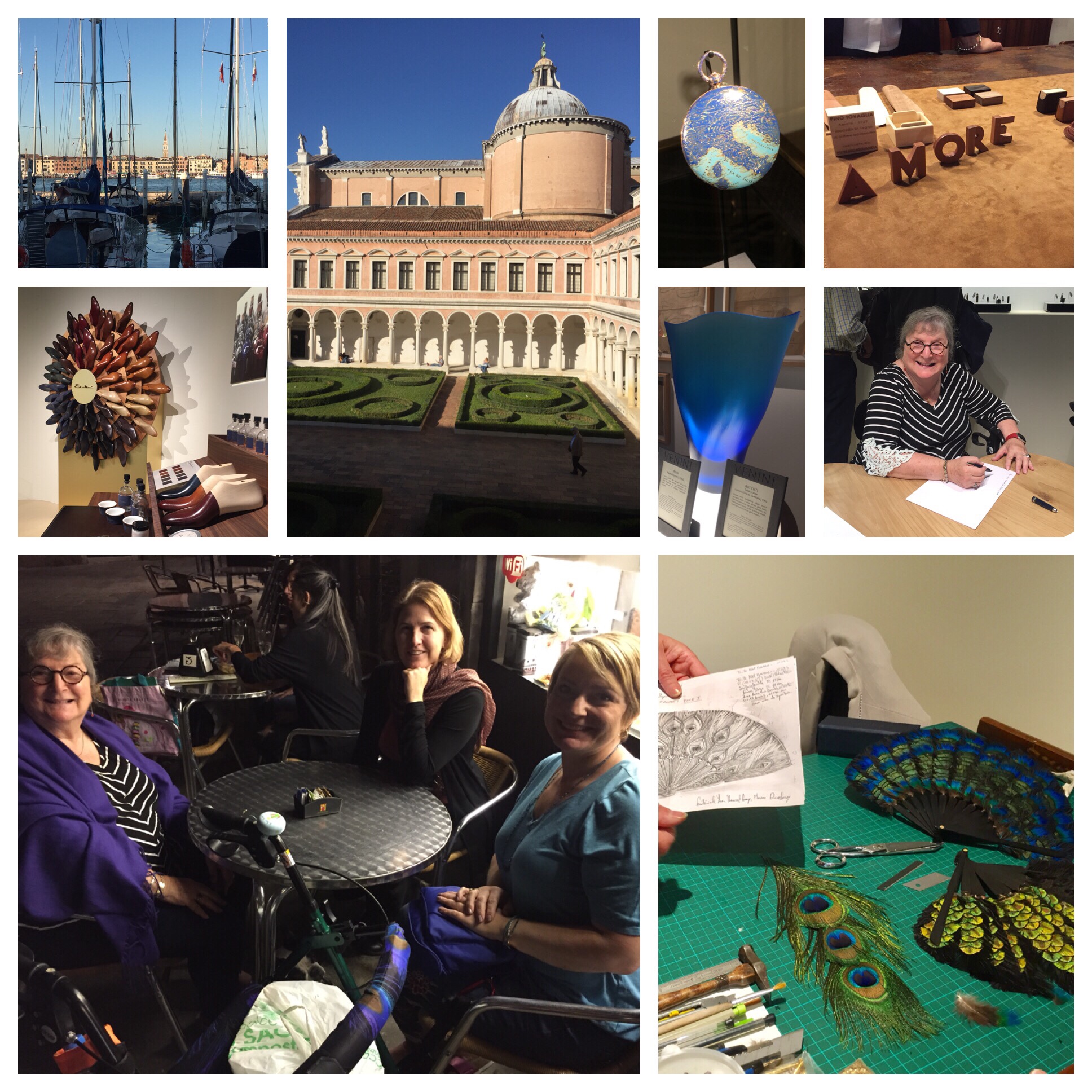 Clockwise from top L: View of Venice through the boats; Gardens at San Giorgio; Map of Italy enameling; “Amore” poetry of wood; Mama loves the Montblanc fountain pen; Blown glass vase; Peacock fans for the queen; Drinks with our new friend, Kris; Wheel of crafted shoe forms
