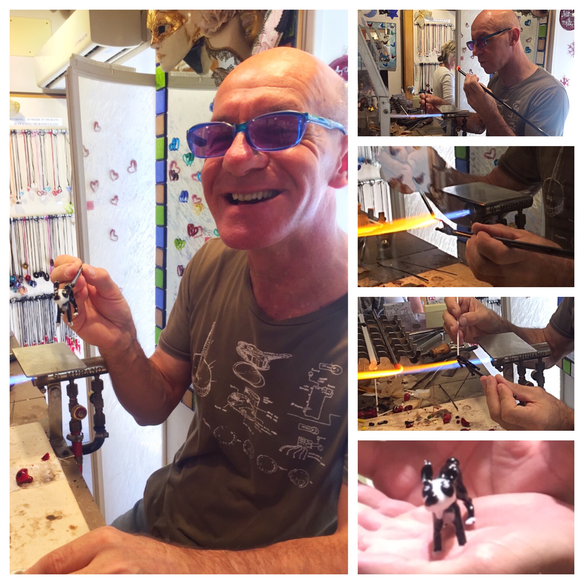 Giorgio, one of the two brothers who runs the shop and makes the glass pieces, was creating ladybugs for wine stopper tops when we arrived. After taking a few photos of Paisley and looking her over closely, he got to work with long sticks of black and white glass, along with a bit of pinkish white glass for her tummy. We had an incredible time watching Paisley appear out of the glass. Giorgio started with her back legs, then body and front legs, finishing with her head and pointed ears. I love how joyful he looks when he shows us the finished piece.