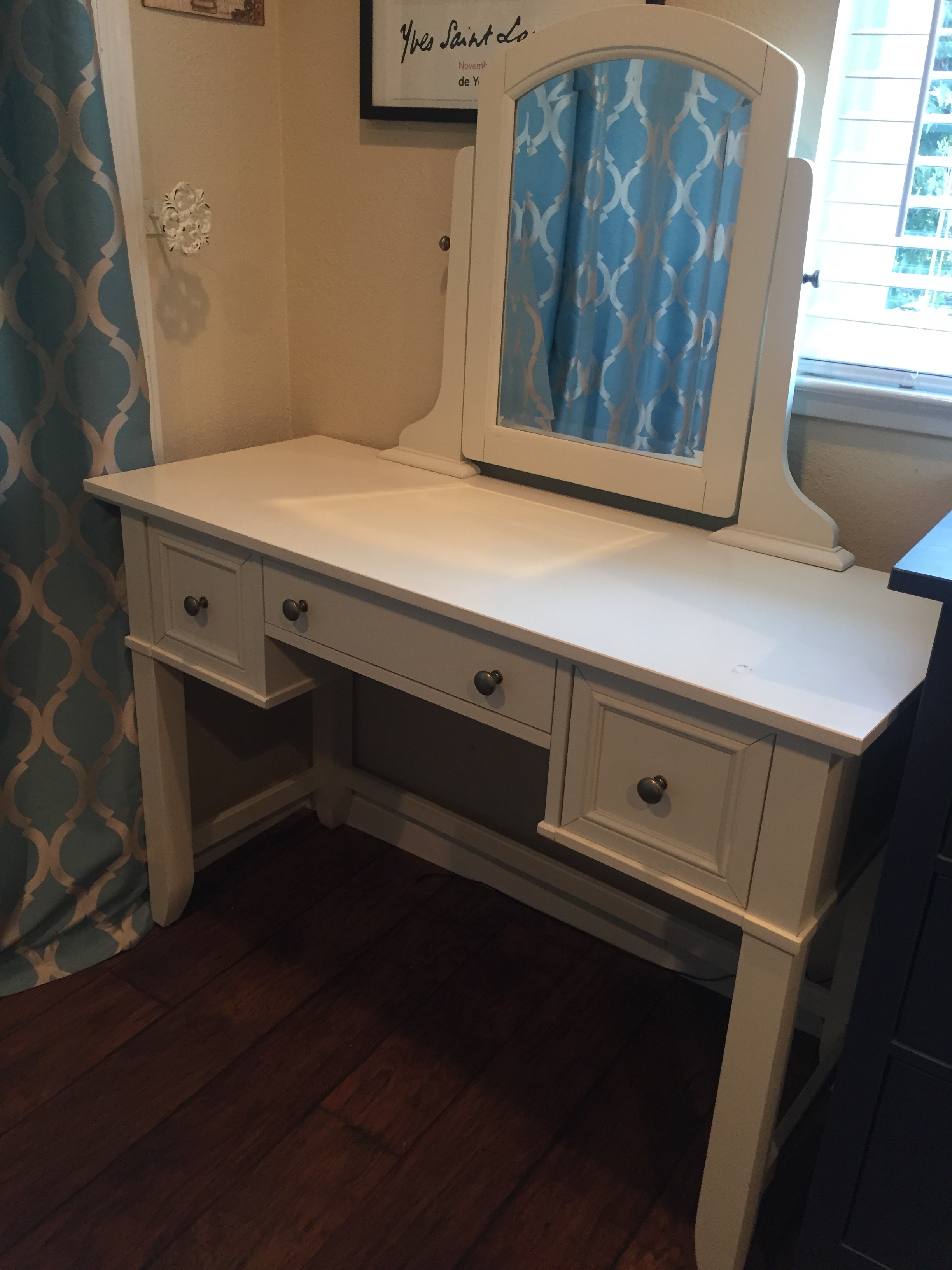I did a little rearranging of my bedroom furniture today. I’m planning to sell this lovely vanity desk (in the photo), because I made space for a comfy chair next to my bed instead. I’ve still got a bit of stuff to go through that’s cluttering my room, but I completed the overhaul.