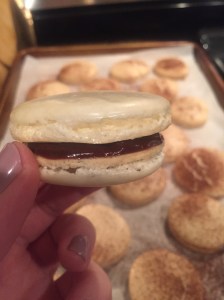 The speckled cookies are espresso flavored, while the pale ones are almond. The filling is an Amaretto Chocolate Ganache, which we discovered we much prefer in a very thin layer. Today’s cookies were a vast improvement so now we’ll have to invite Margo back to make up for the lumpy ones.