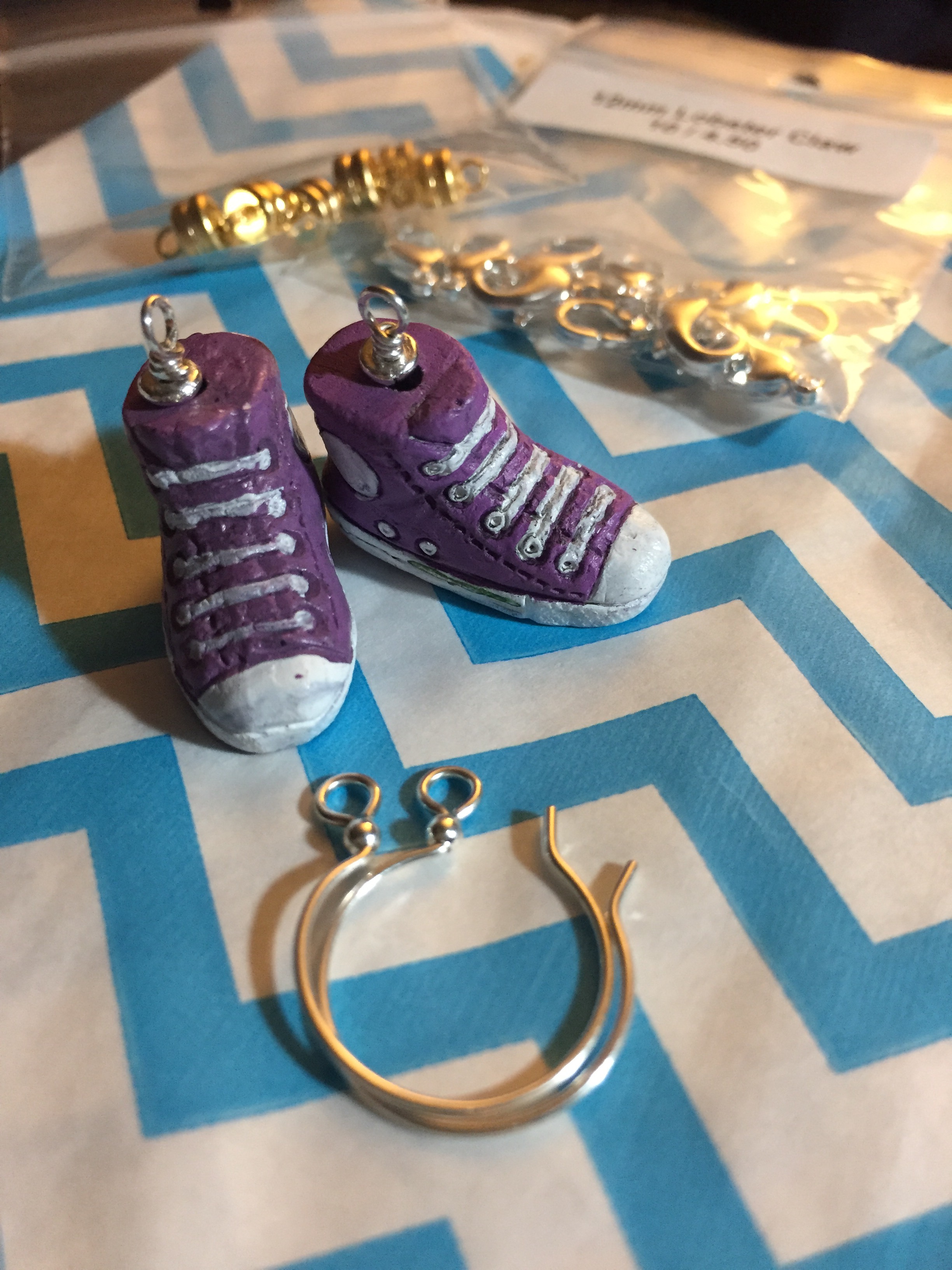 We made it back this evening, just before they closed. After gathering the necessary clasps, the helpful staff gave me a skills refresher on using multiple needle-nose pliers to create lovely loops (like those you see on top of these adorable purple sneakers, which will soon be earrings for Mama).
