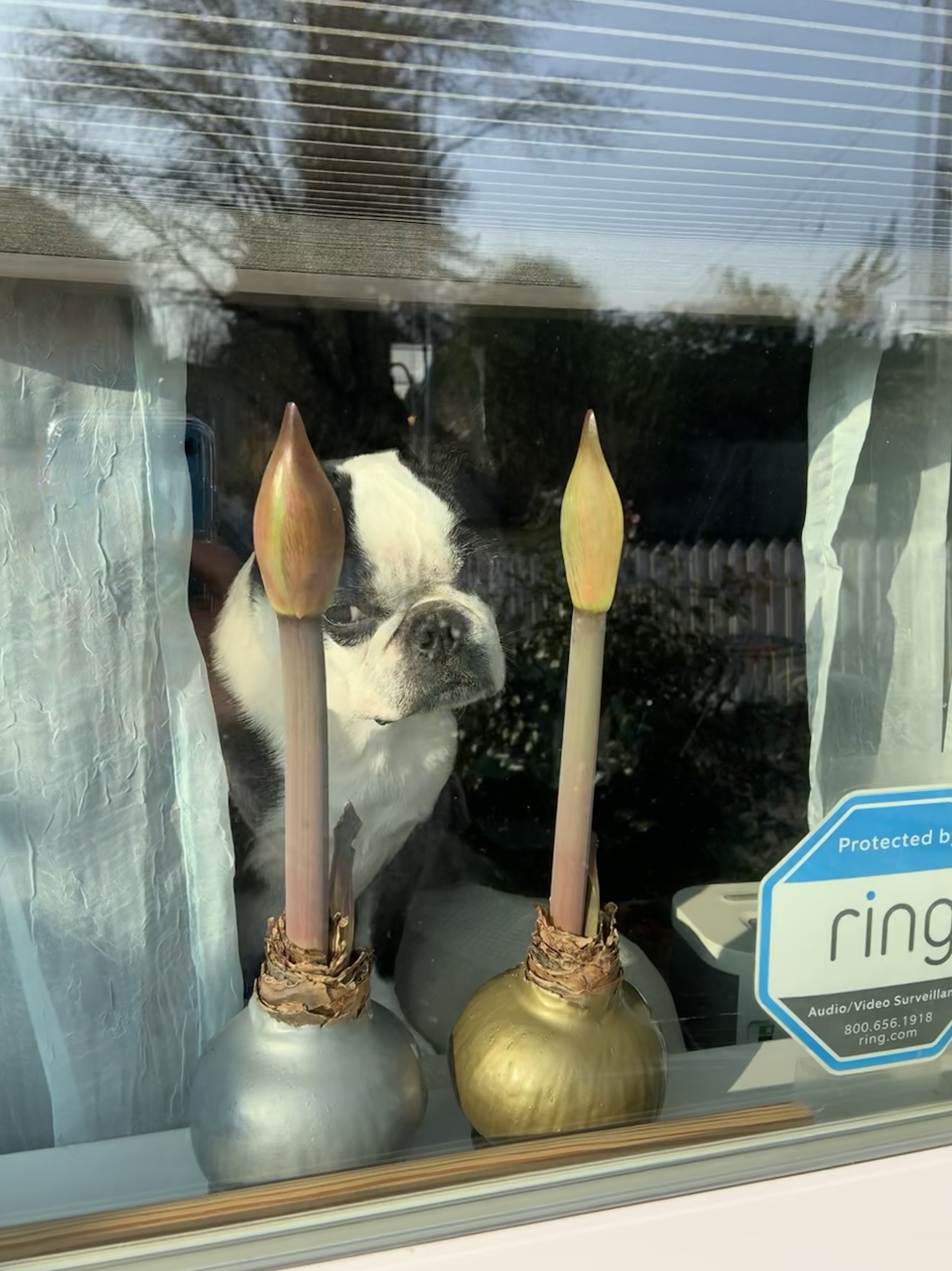 Paisley is sitting on the back of the couch, looking out the window between the two new Amaryllis stalks growing from our wax-covered bulbs. Her look of reproach makes me giggle. I love being greeted by this sassy, sweet girl! Can you spot me in the reflection?