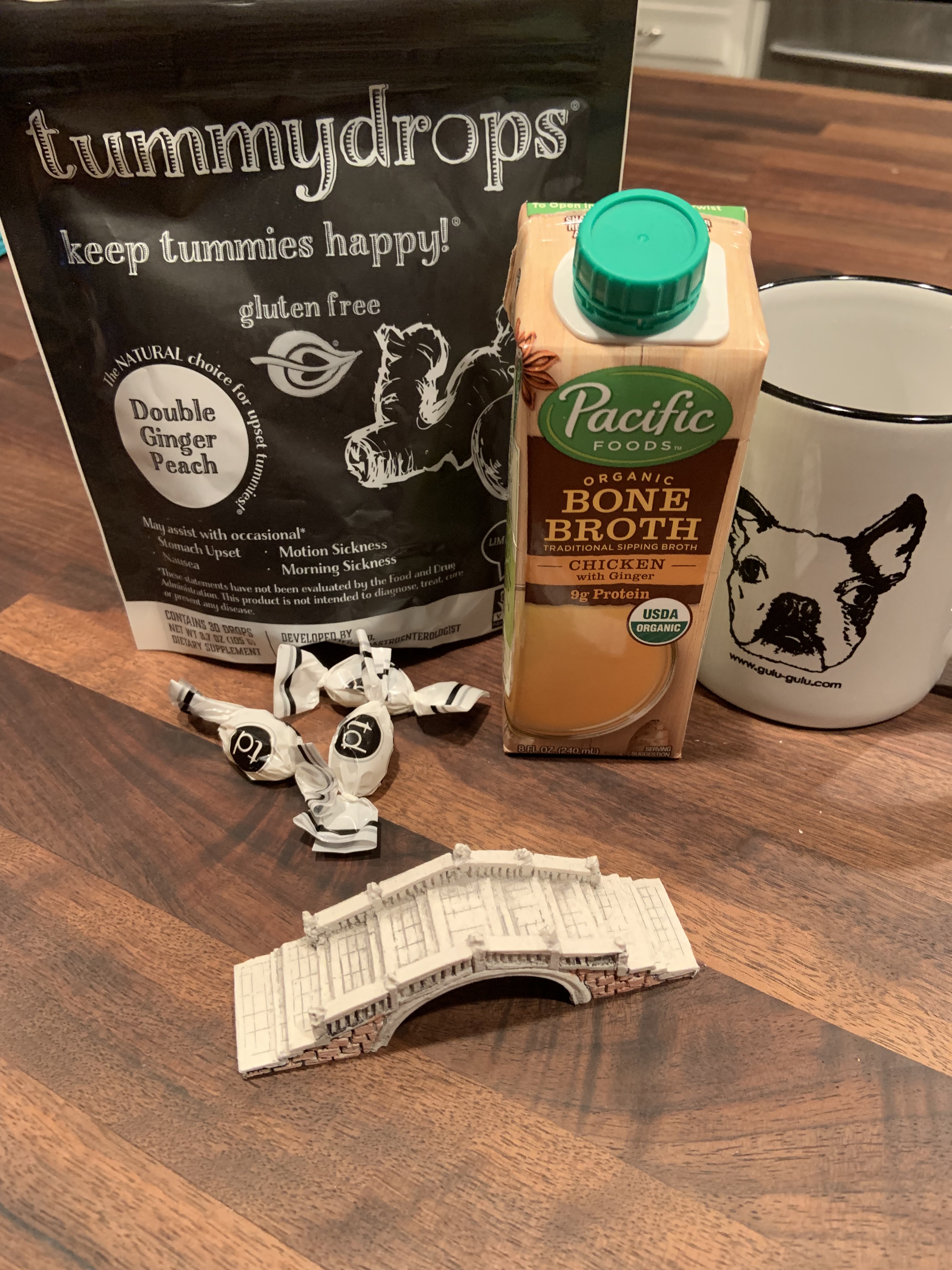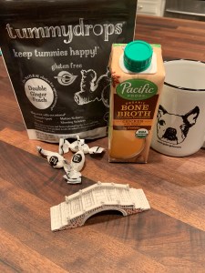 When I finally managed to get up this evening, I found my way back to solid food with the help of ginger pear “tummydrops” and a mug of chicken ginger bone broth.