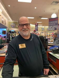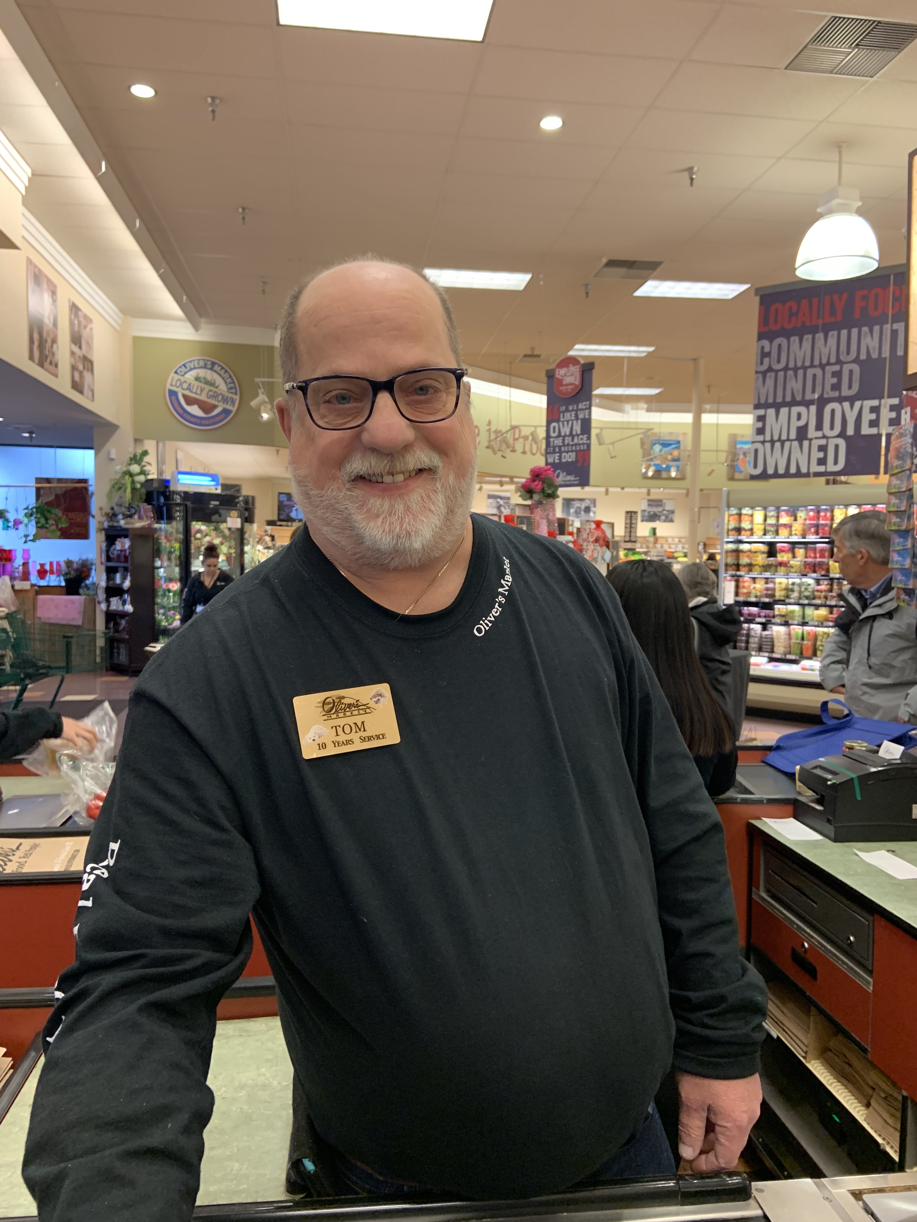 Tom mans the register at Oliver’s with a smile and plenty of cute dog pics