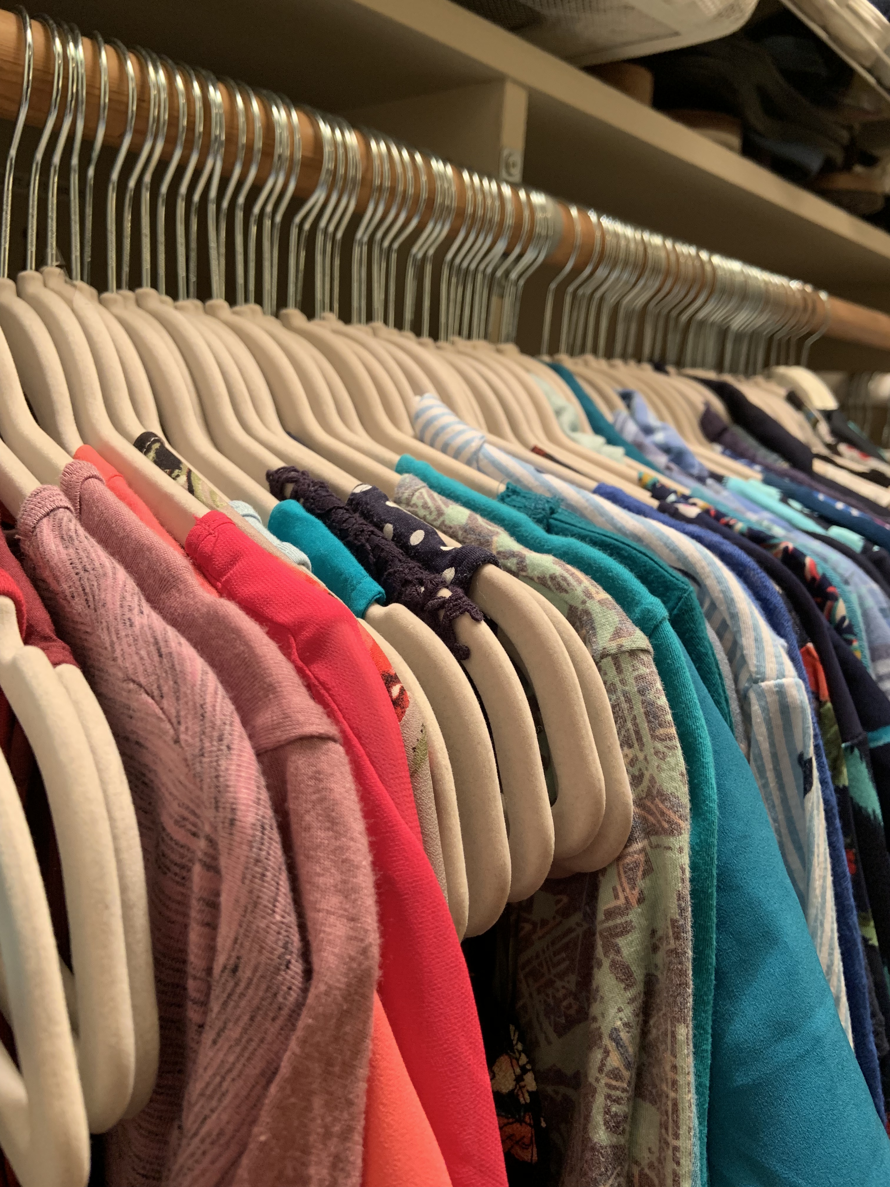 I switched out my old bulky plastic hangers for these super skinny ones to optimize the small space. It’s easier to move garments about and see everything. I discovered some new outfits and loved all the evidence of my obvious obsession with polka dots.