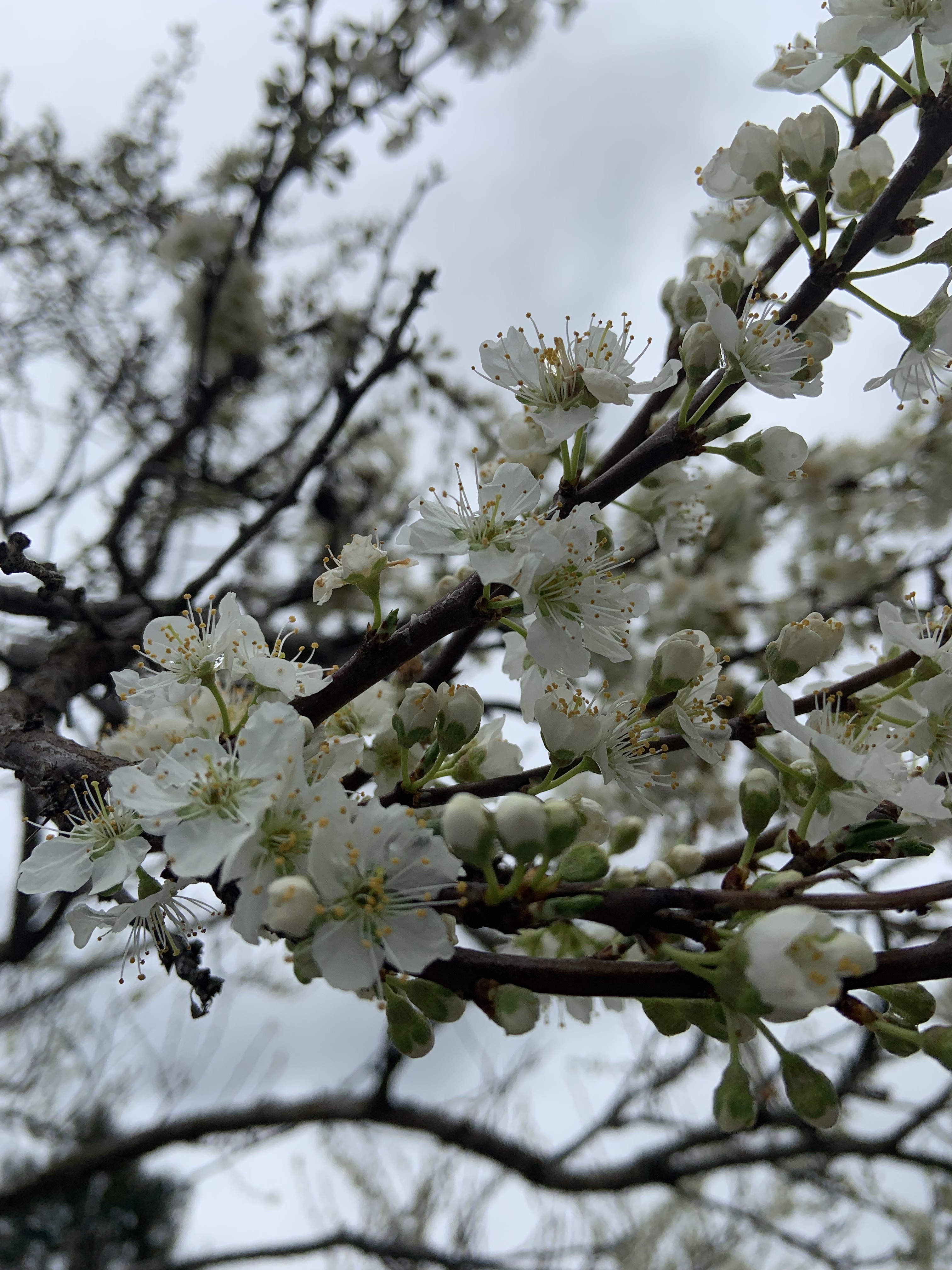 Our plum tree burst into these gorgeous white blossoms, which then led us to discover that Mama’s beloved Abutilon has also started blooming. We were so thrilled these delicate red flowers made it through the cold.