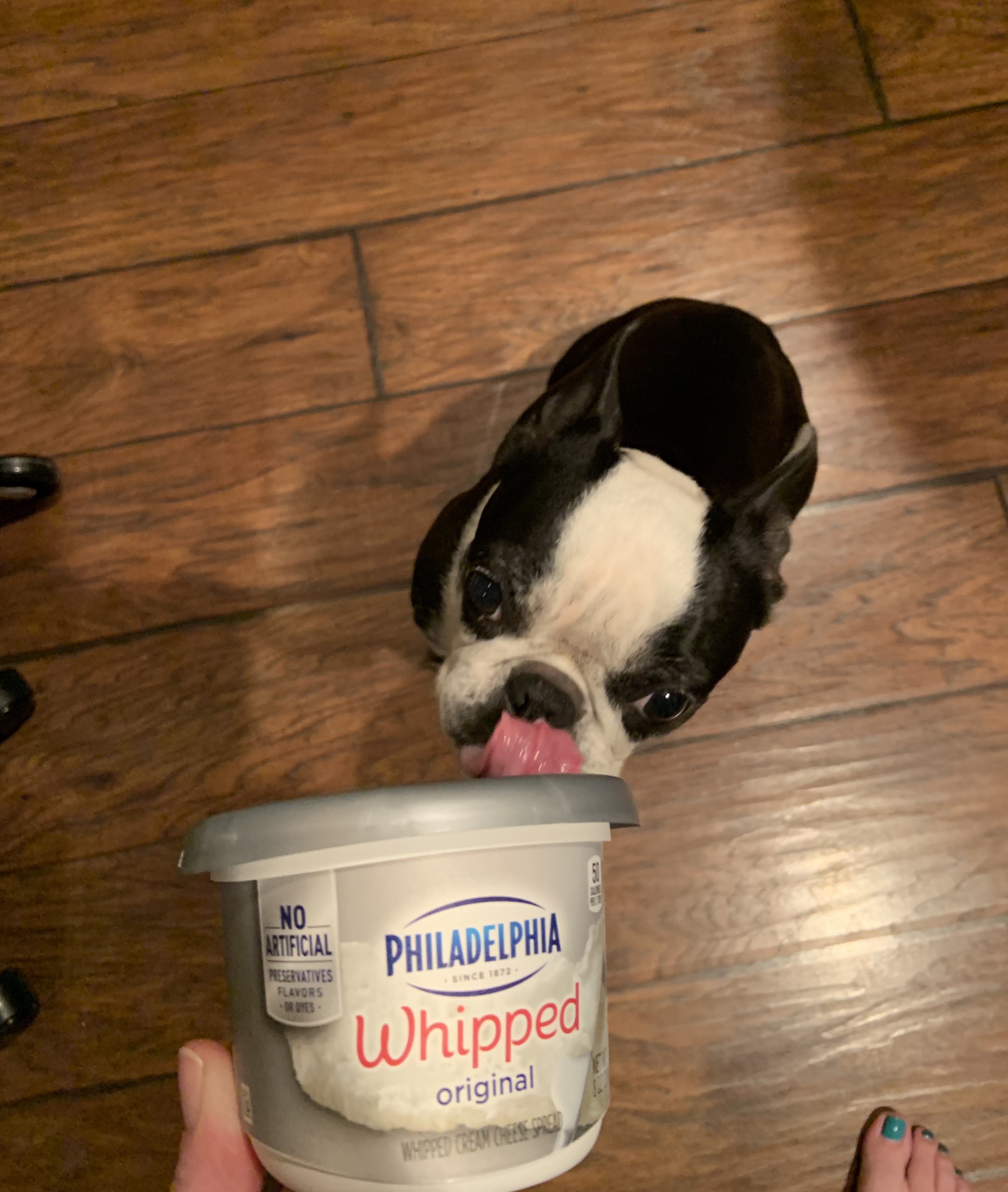 Our sweet girl Paisley has become more fickle in her tastes, deciding she no longer cares for Pill Pockets (flavored treats used to hide medications). That’s a problem since she’s been on a recent course of antibiotics twice a day and her chicken allergy limits our options. Thankfully, like the good little Jewish dog she is, Paisley LOVES cream cheese!
