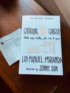 After learning about my #OneGoodThing writings on this blog, the parents of our wonderful Passover Seder host sent me this uplifting book for my birthday. I was deeply touched by the thoughtfulness of this gift—and we are loving Lin-Manuel Miranda’s little pep talks!