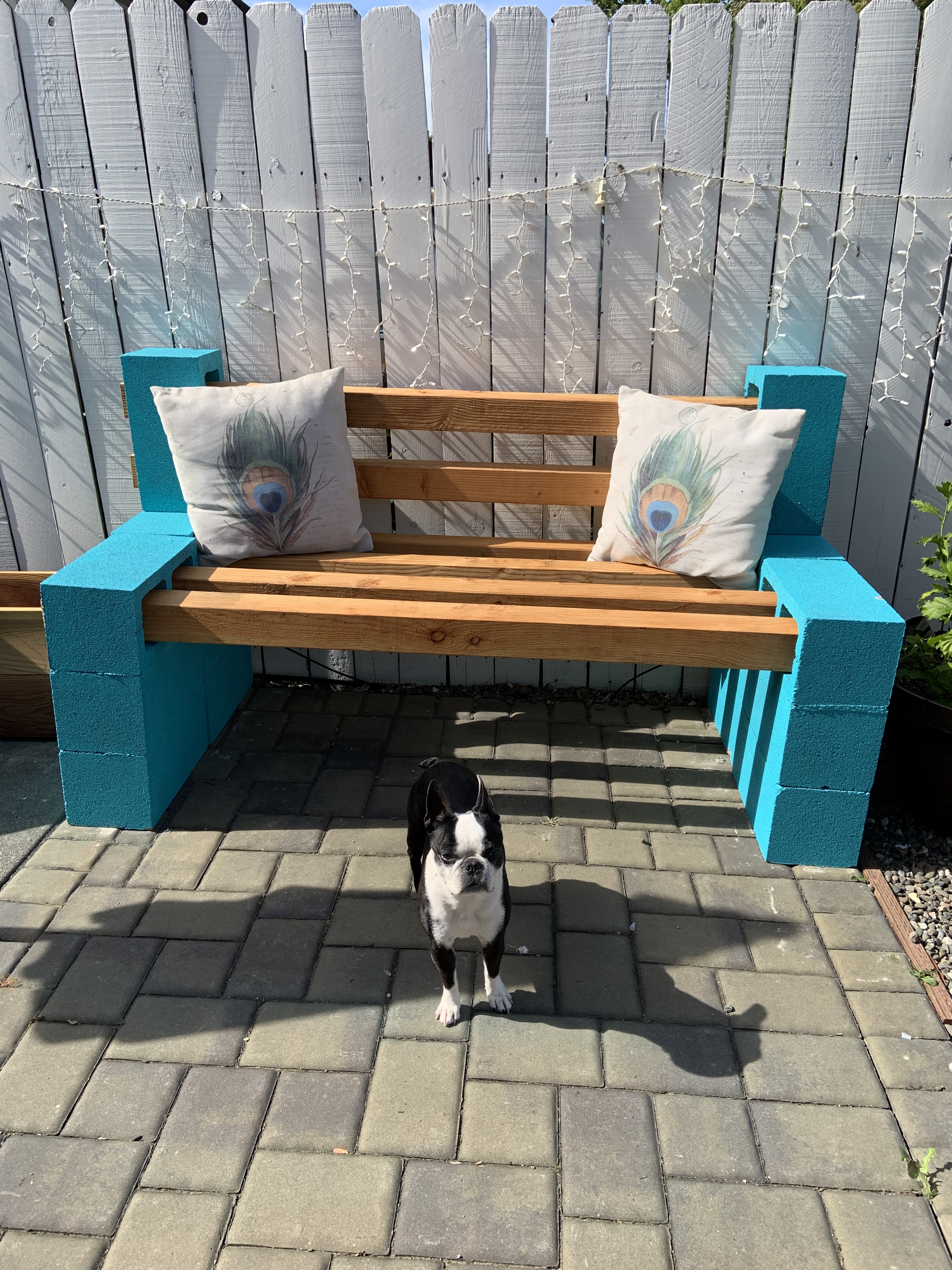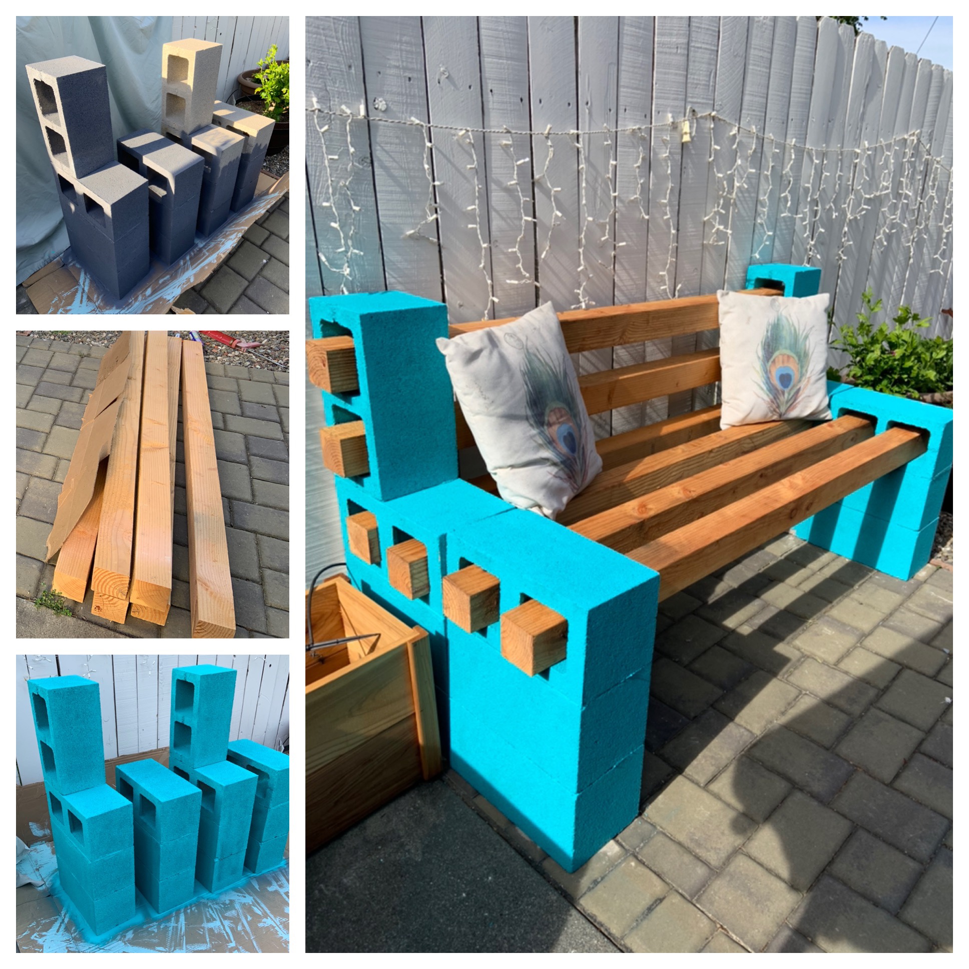 Stacks of cinderblocks are glued together with construction adhesive and spray painted, before placing 4-by-4 wood planks through the openings. I added these two peacock pillows that we already owned—and voila!