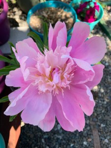 The pink peony we’ve been watching grow in our garden has finally opened into full bloom.