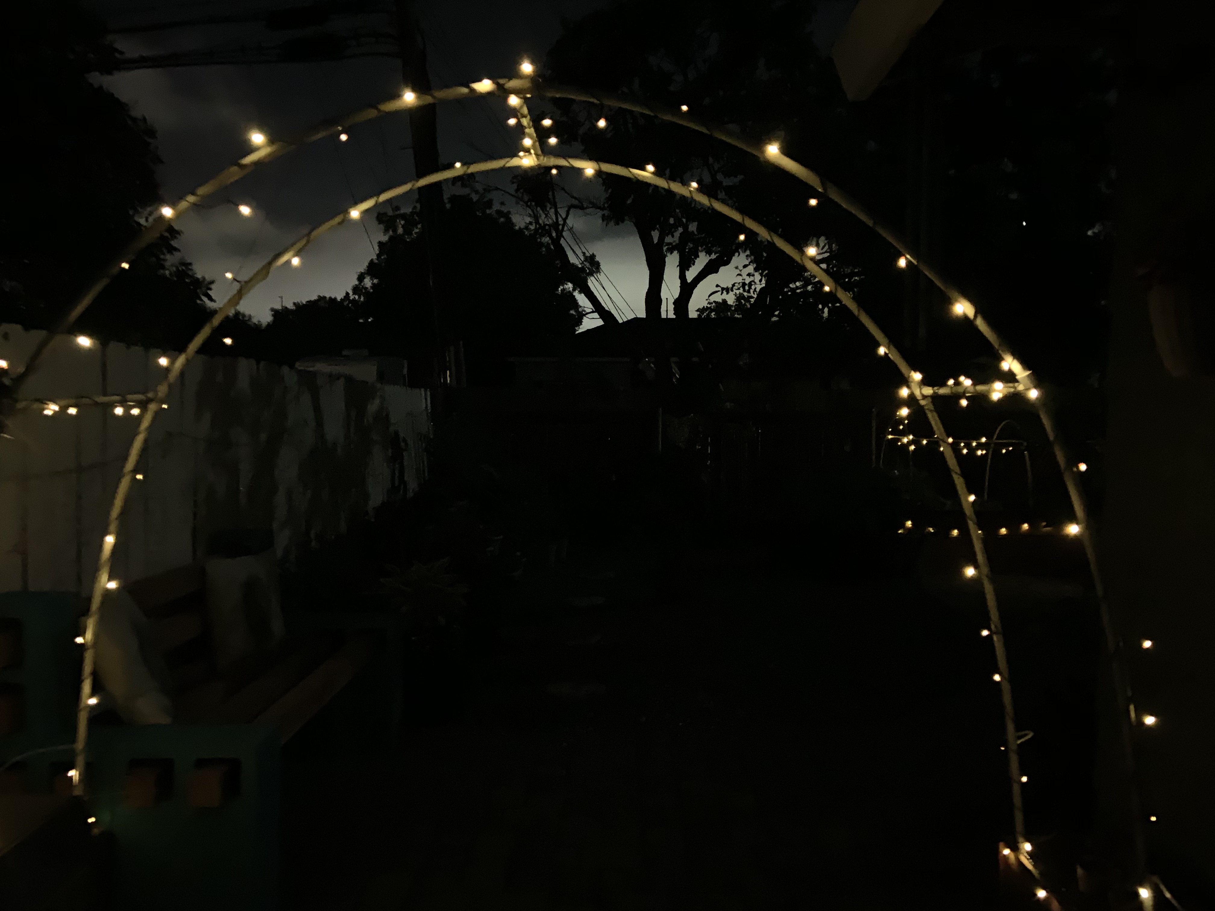 Another migraine took me out yesterday, but late at night, I managed vertical long enough to see the fruits of my previous day’s labor. The solar lights on our garden arch got enough sun to illuminate.