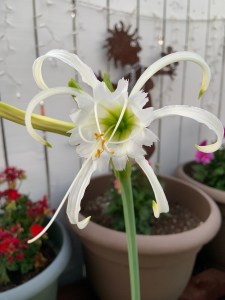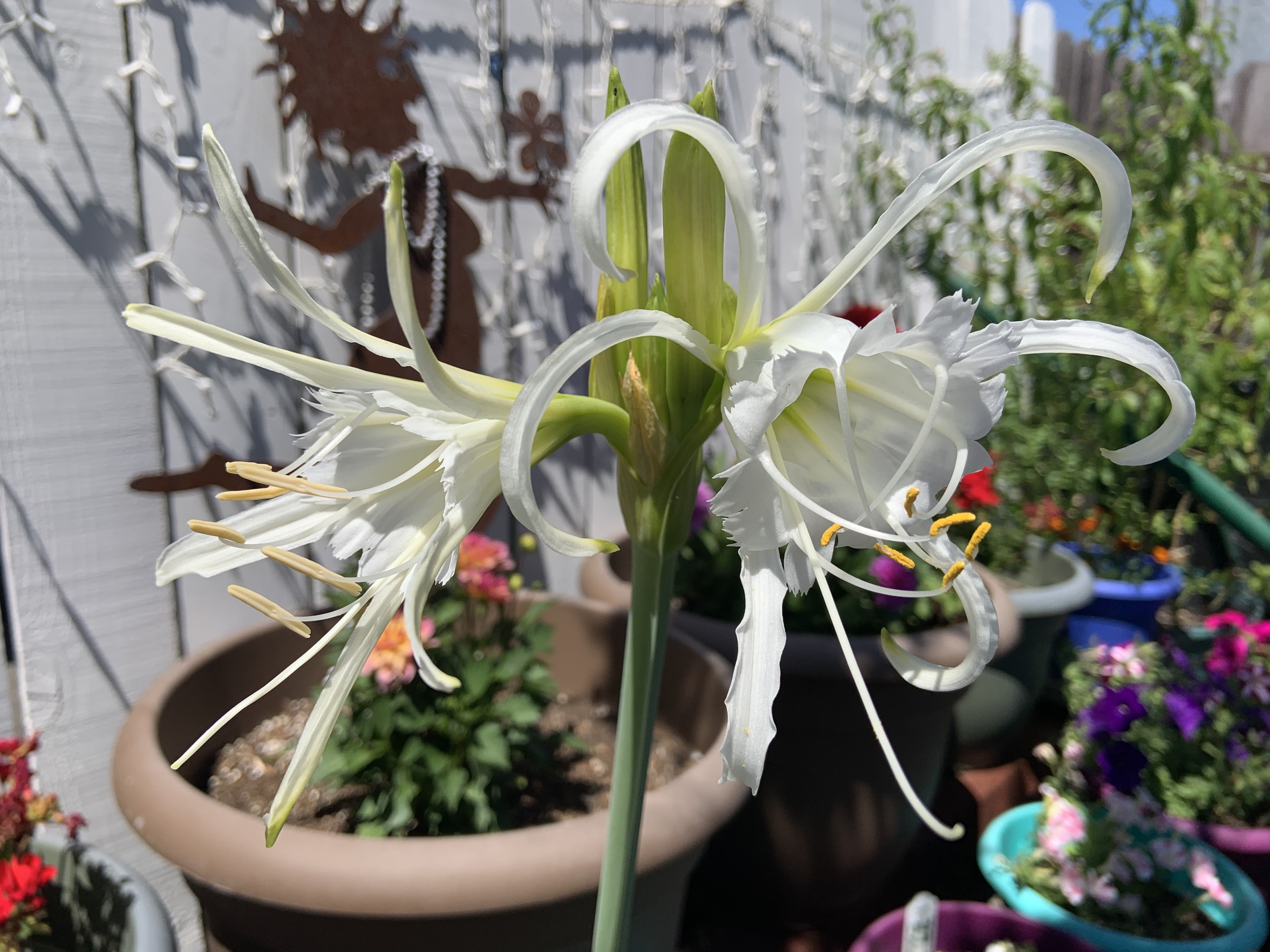 This fantastic flower just bloomed in our garden late yesterday. It’s the first time this bulb has been successful, but now we can’t remember what it’s called. Mama and I couldn’t wait to go see the wildness of this flower when we got up today—and then we found not one, but TWO!