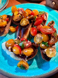 I thumbed through our Marcella Hazan Italian cookbook to make sure I wasn’t forgetting any important components. These tiny heirloom tomatoes paired magnificently with fresh basil from our garden and crushed garlic. I overtoasted the baguette, but it was still scrumptious!
